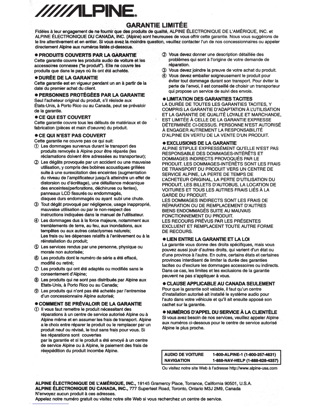 services, veuillez appeler Alpine