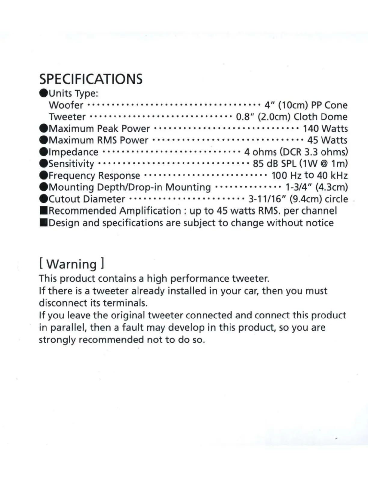 Tweeter • • • • • • • • • • • • • • • • • • • • • • • • • • • • • • 0.8" (2.0cm) Cloth Dome