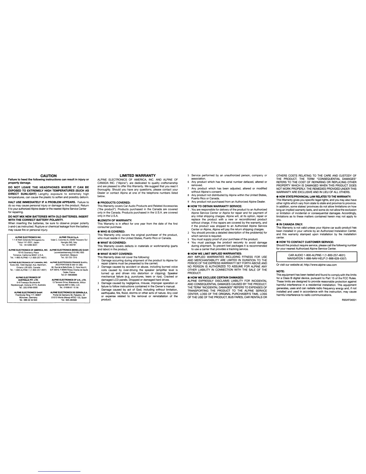 Alpine SHS-N205 - Cautionary Notes; Temperature and Damage Warnings; Battery Handling Precautions; Limited Warranty Information