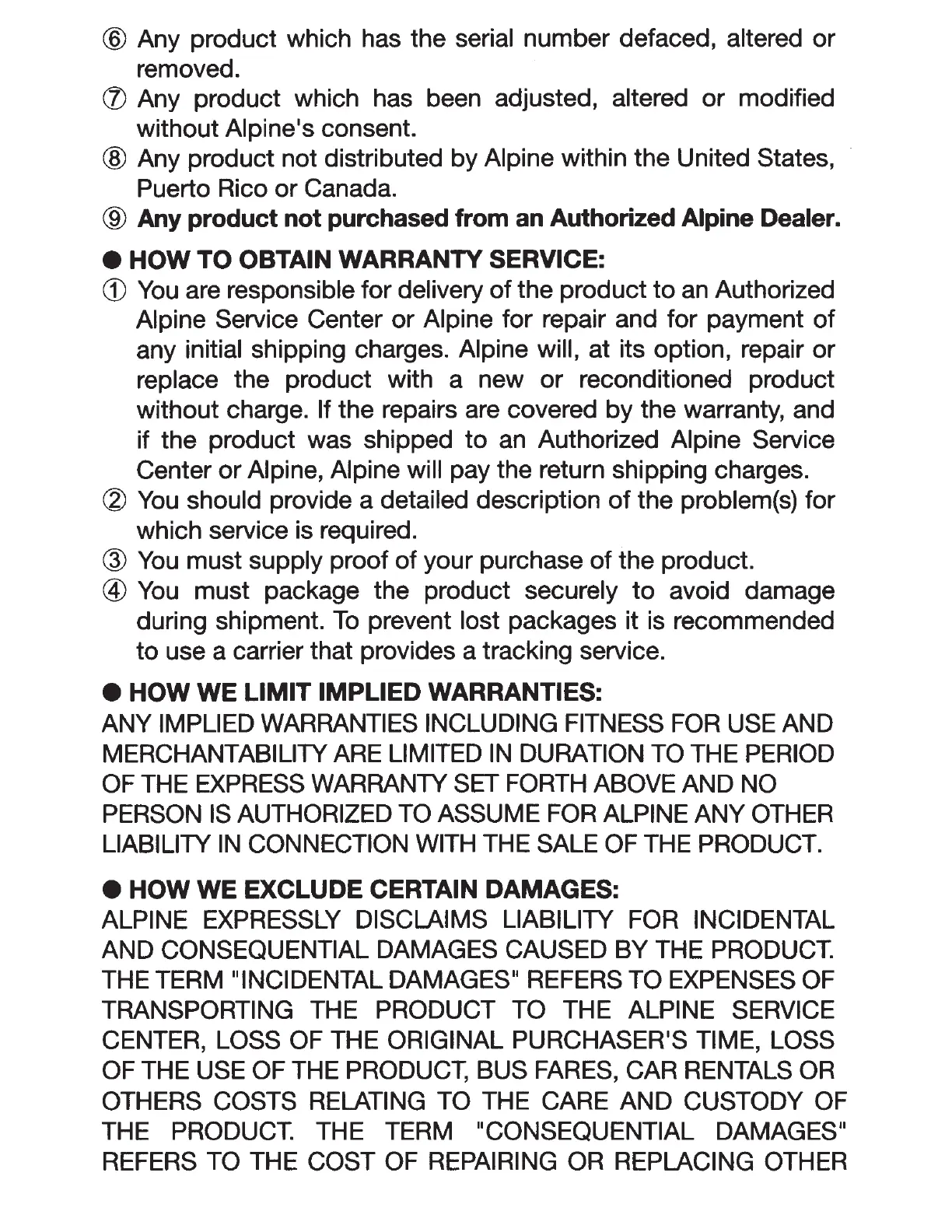 ALPINE EXPRESSLY DISCLAIMS LIABILITY FOR INCIDENTAL