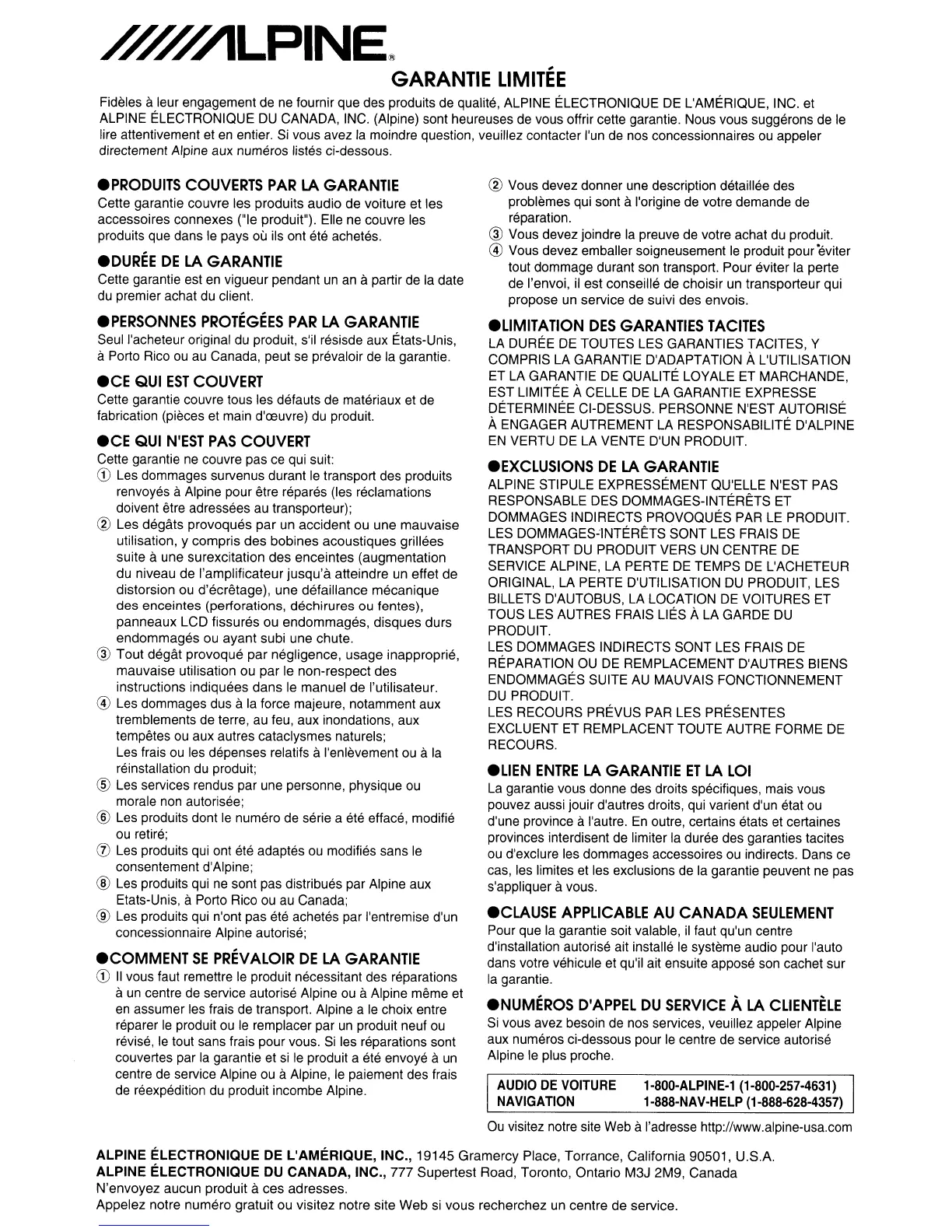 ALPINE ELECTRONIQUE DU CANADA, INC. (Alpine) sont heureuses de vous olfrir cette garantie. Nous vous suggerons de