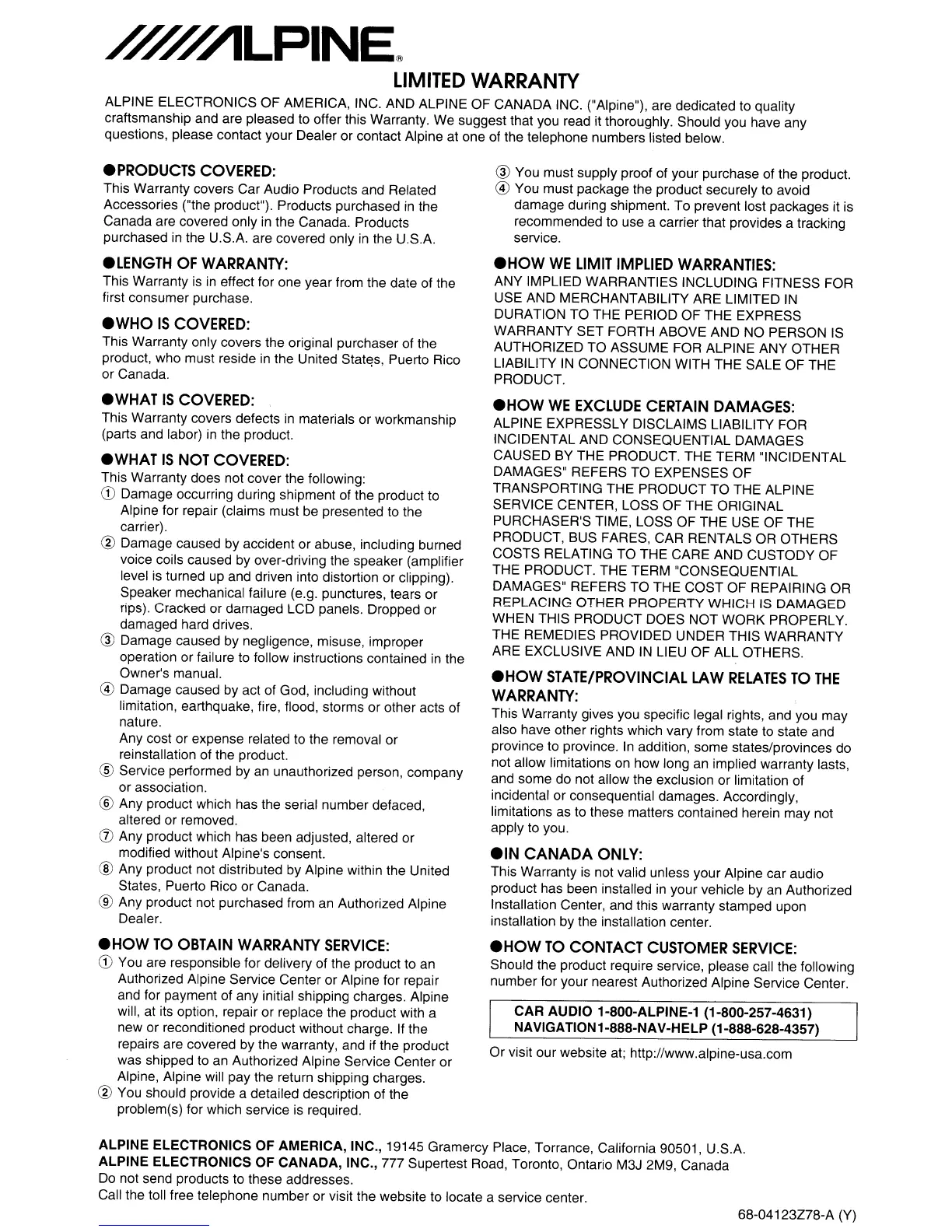 CAR AUDIO 1-800-ALPINE-1 (1-800-257-4631)