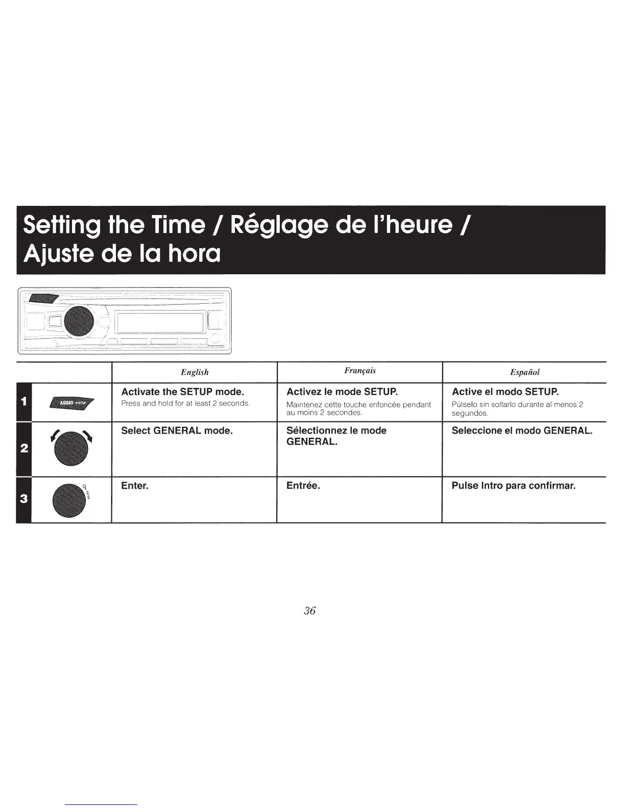 Alpine UTE-52BT - Setting the Time; Réglage de lheure; Ajuste de la hora; Activate the SETUP mode.; Select GENERAL mode.