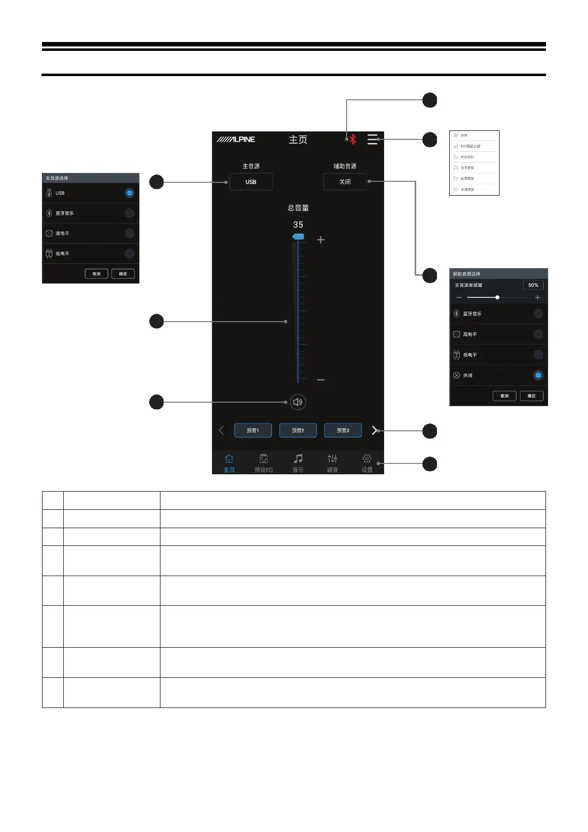 Select the master audio source (USB, Bluetooth, High level and AUX).
