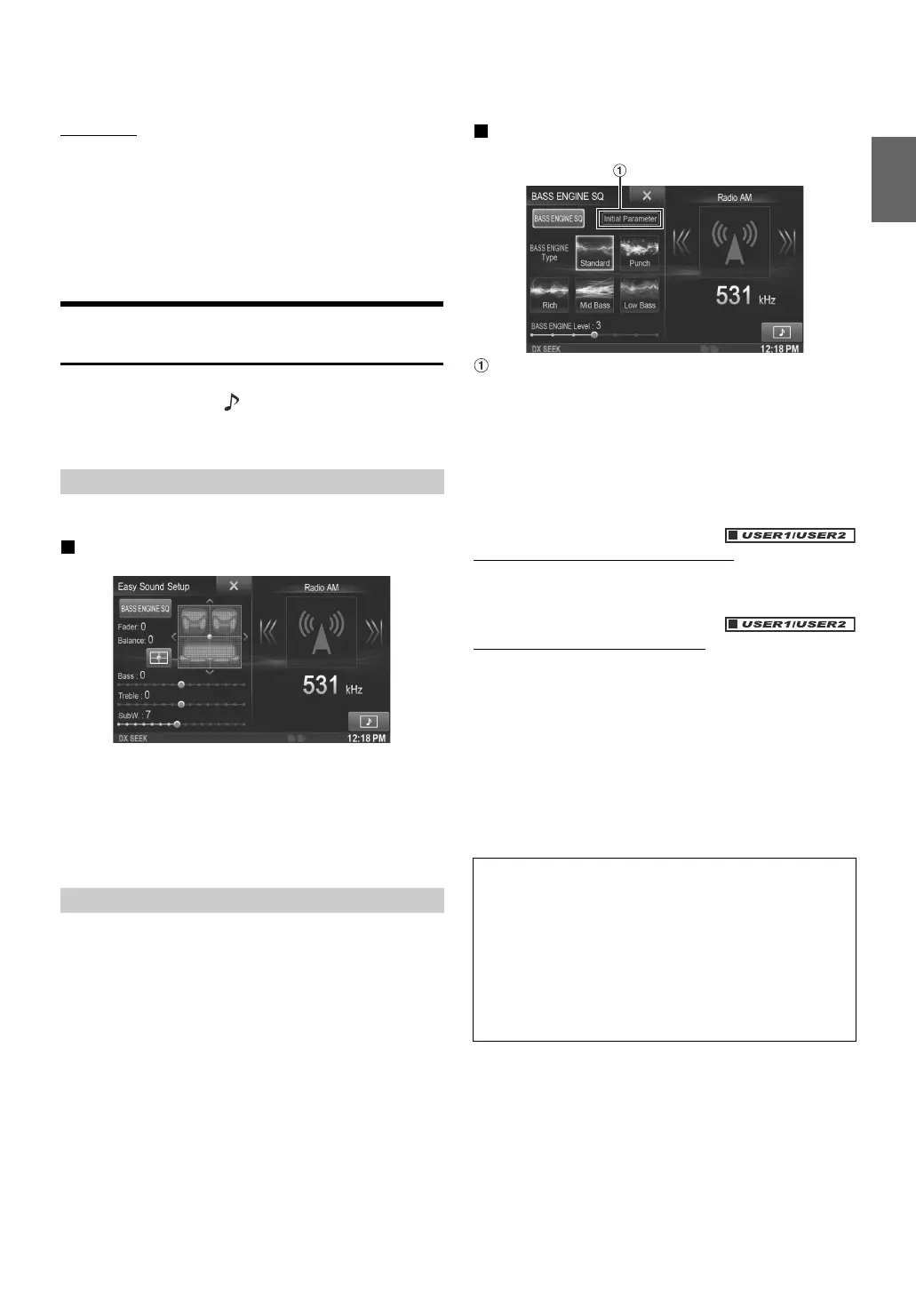 Balance/Bass level/Treble level/Subwoofer level and BASS ENGINE