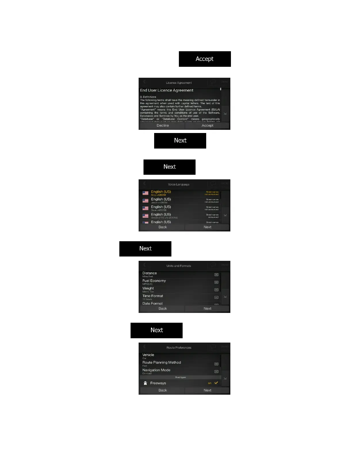 4. Select the language and speaker used for voice guidance messages. Later you can change it in