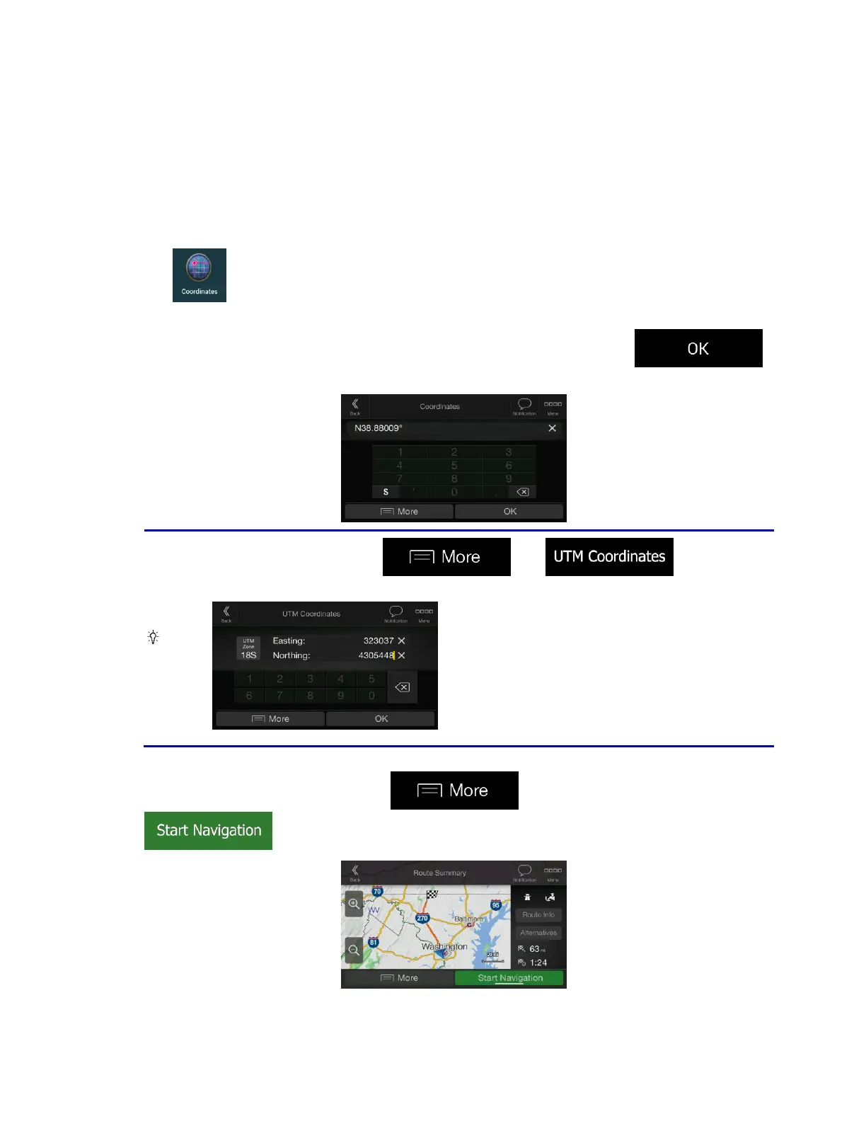 To select a destination by entering its coordinates, perform the following steps:
