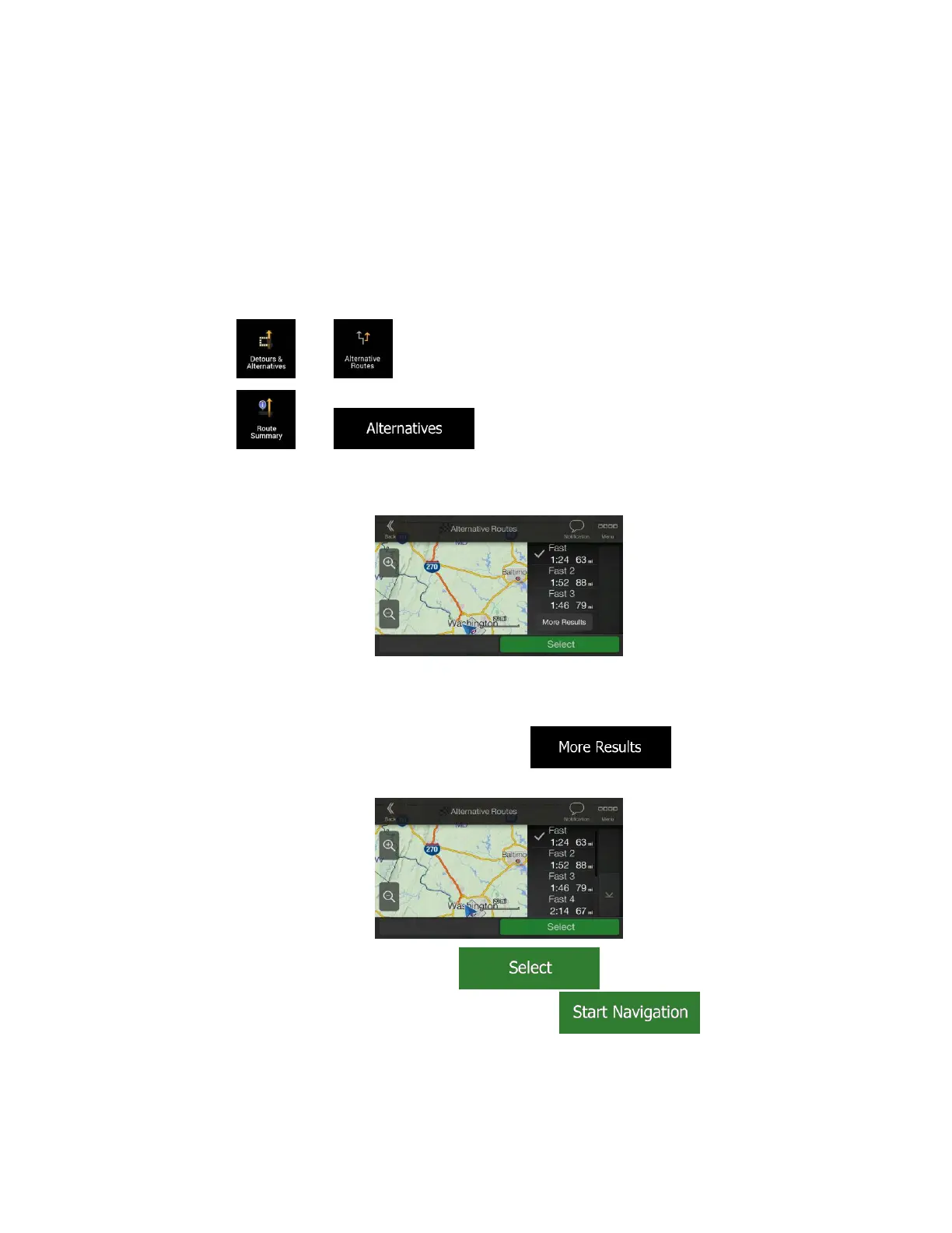 2. You can access the list of route alternatives from the Navigation menu in one of the following