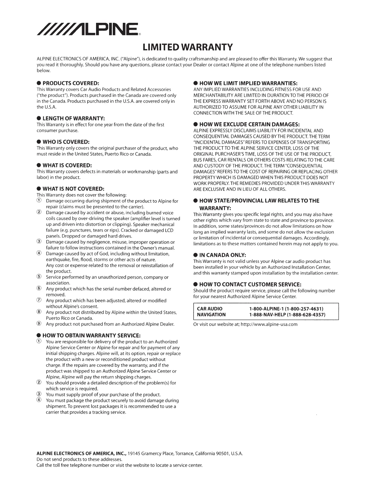ALPINE ELECTRONICS OF AMERICA, INC., 19145 Gramercy Place, Torrance, California 90501,