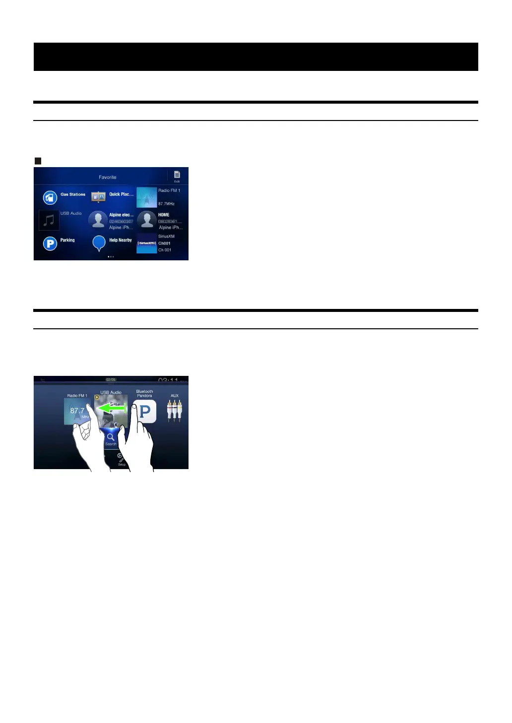 You can change a screen or a page by swiping the touch screen vertically or horizontally with your finger. For details, see “Touch Screen Operation”