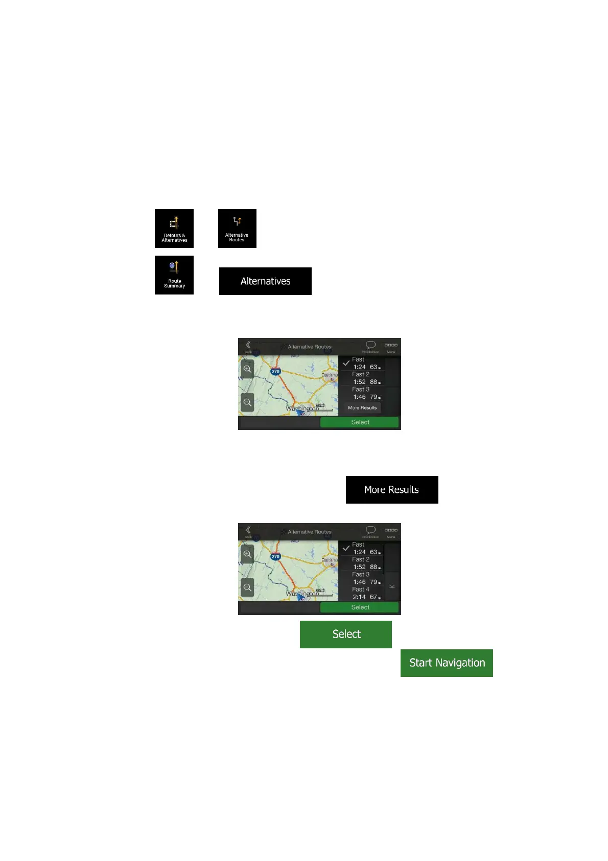 You can access the list of route alternatives from the Navigation menu in one of the following