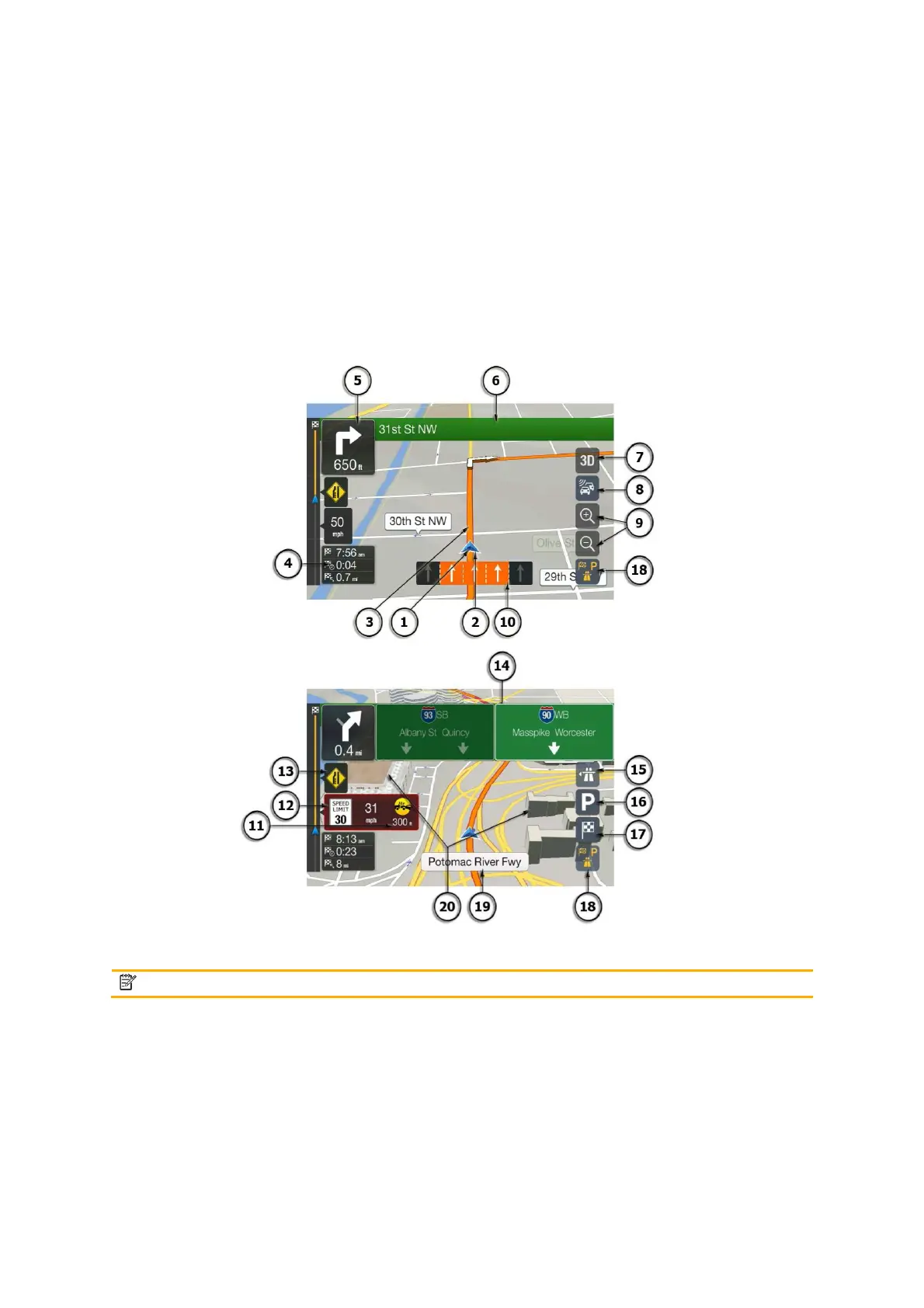 The navigation view displays the following screen buttons, data fields, and route information on the