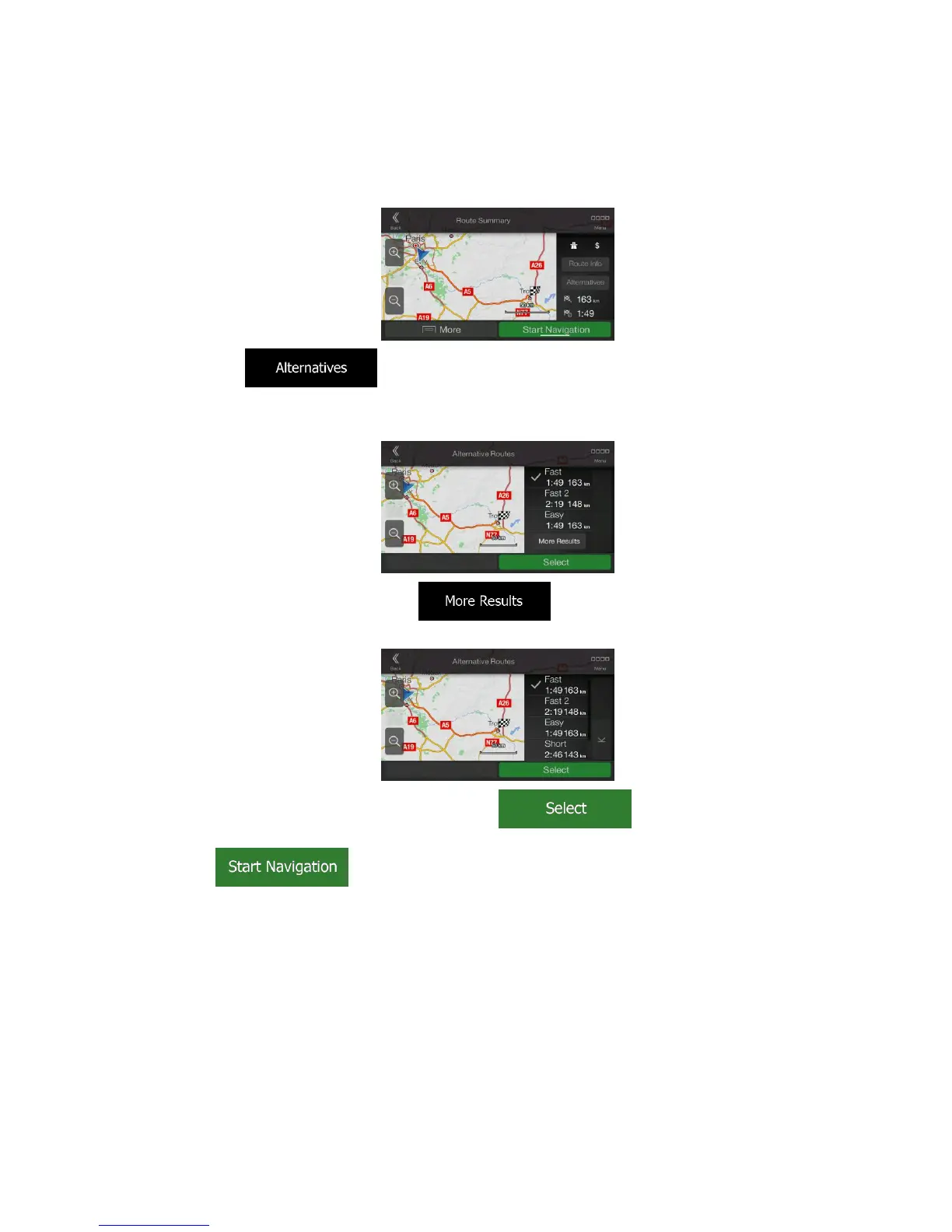 1. Select a destination as explained earlier, and go to the route confirmation screen.