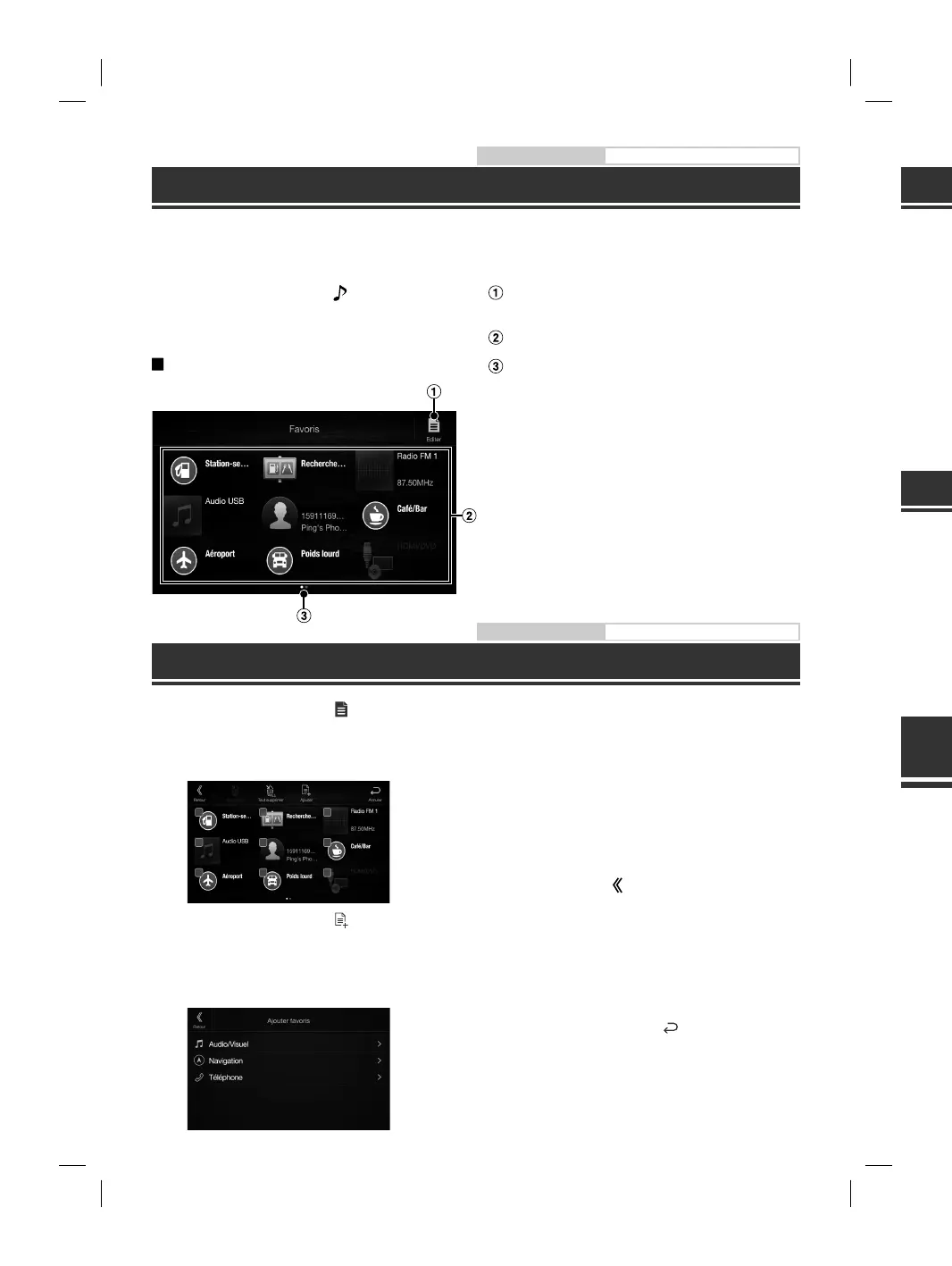 utilisés tels que la source audio, la fonction de recherche de navigation, etc., sur l’écran des favoris. Vous pouvez