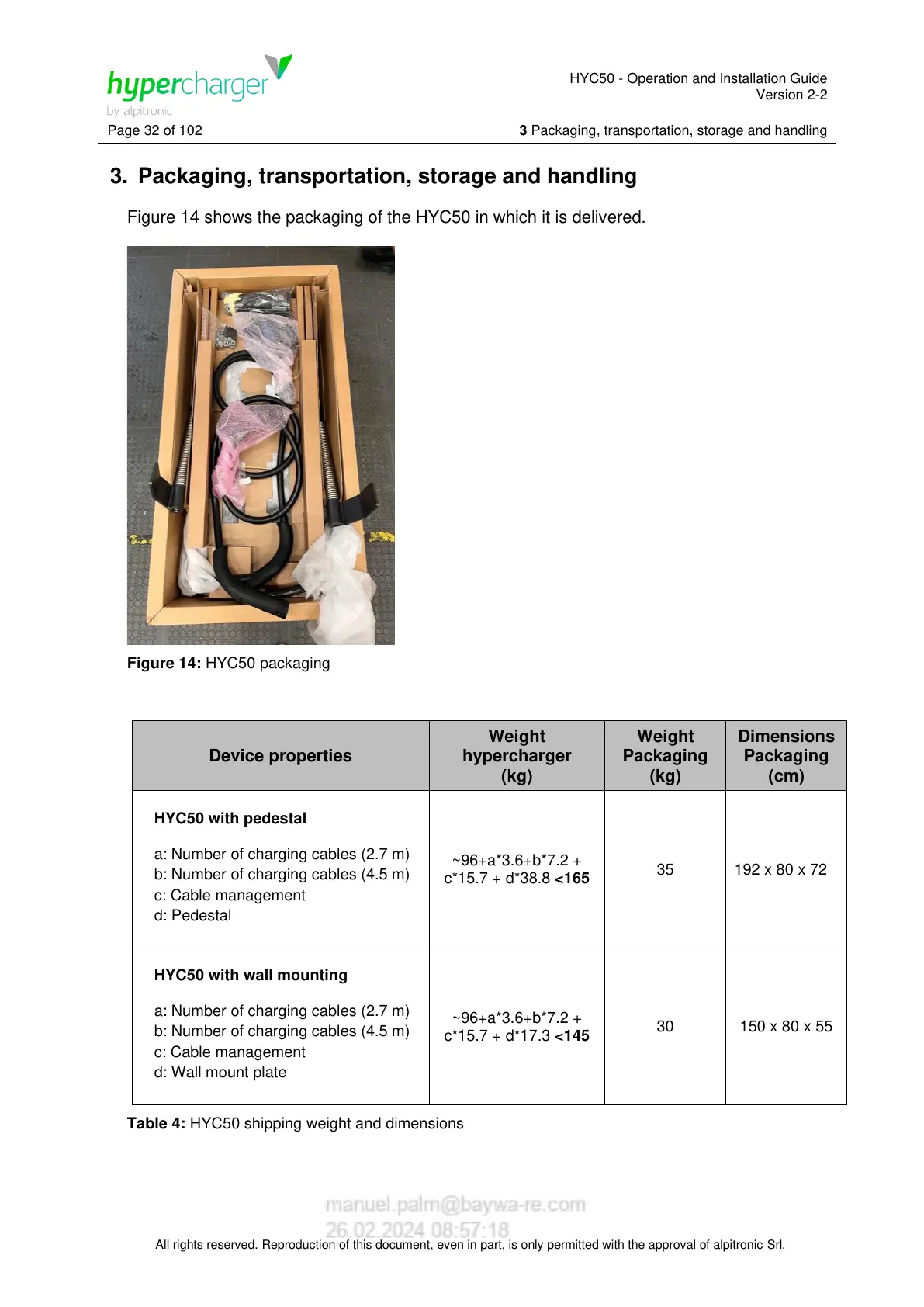 Table 4: HYC50 shipping weight and dimensions