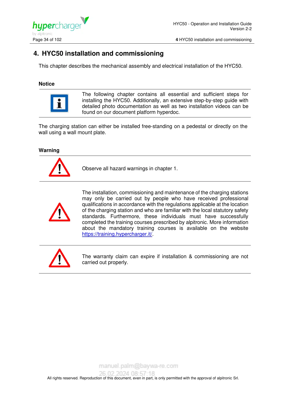 This chapter describes the mechanical assembly and electrical installation of the HYC50.