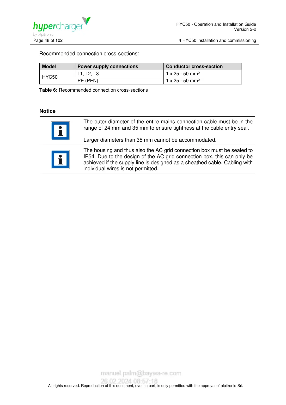 Table 6: Recommended connection cross-sections