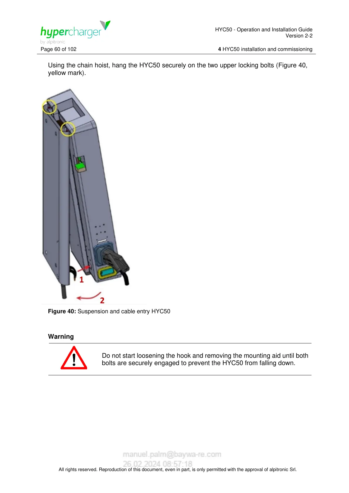 Using the chain hoist, hang the HYC50 securely on the two upper locking bolts (Figure 40,
