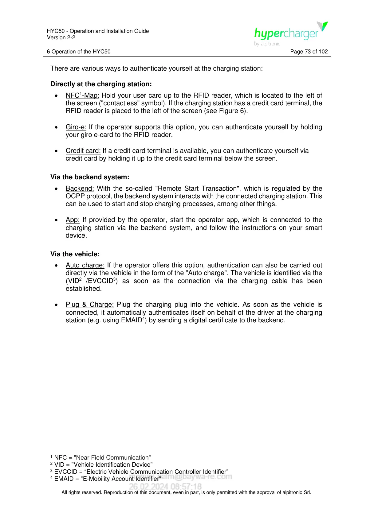 • Auto charge: If the operator offers this option, authentication can also be carried out