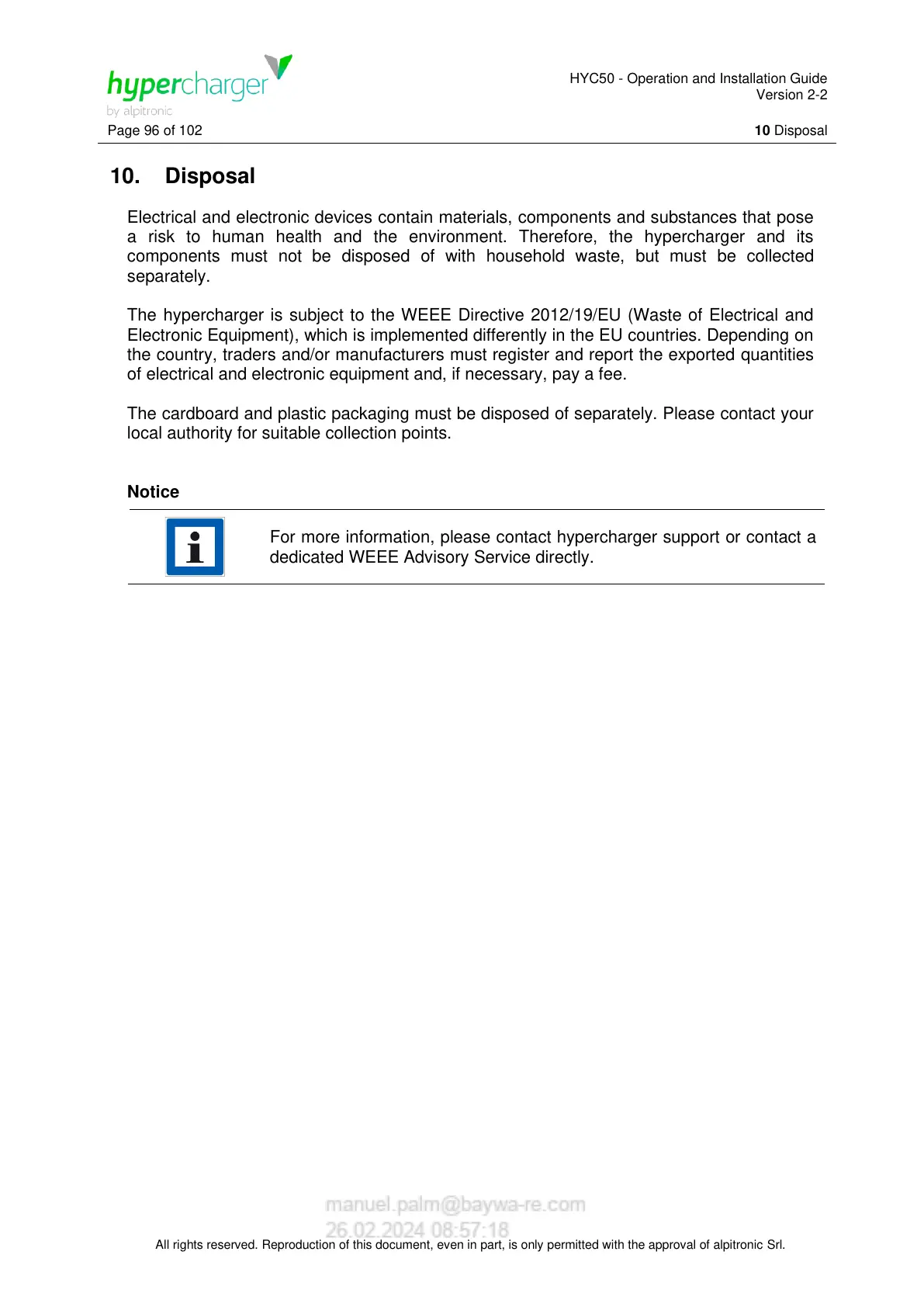 The hypercharger is subject to the WEEE Directive 2012/19/EU (Waste of Electrical and