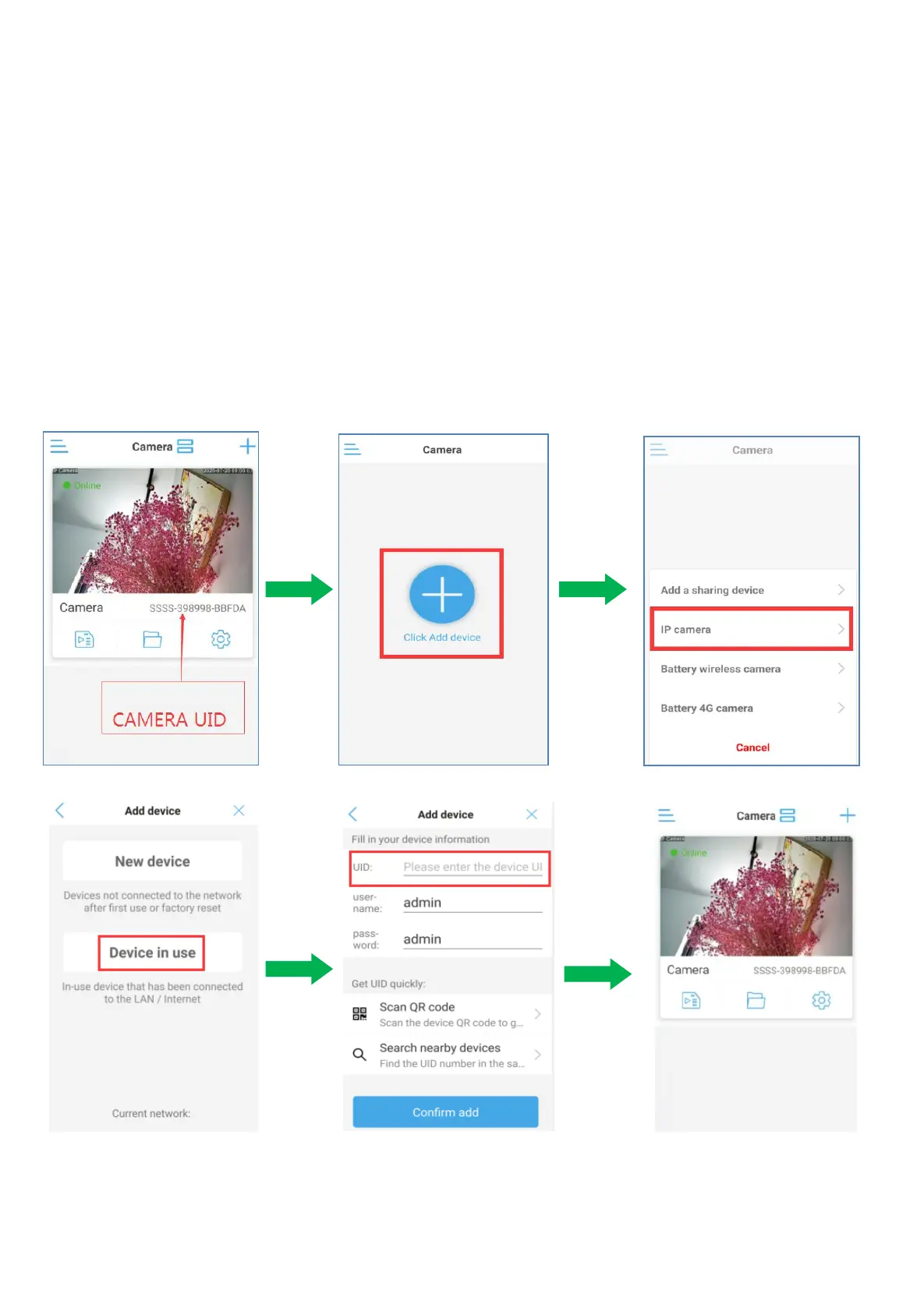 a. Return to the main interface of the camera, you will see the camera's UID: SSSS-398998-BBFDA. As