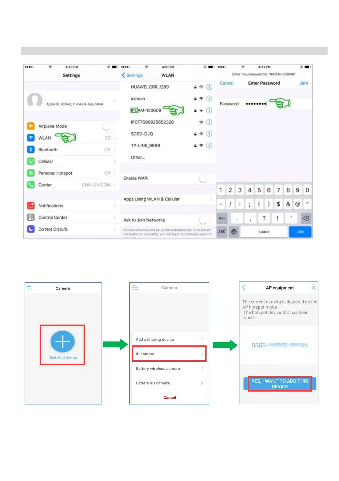 7. Tap “Click Add device” Tap “IP camera” The hotspot device UID will be