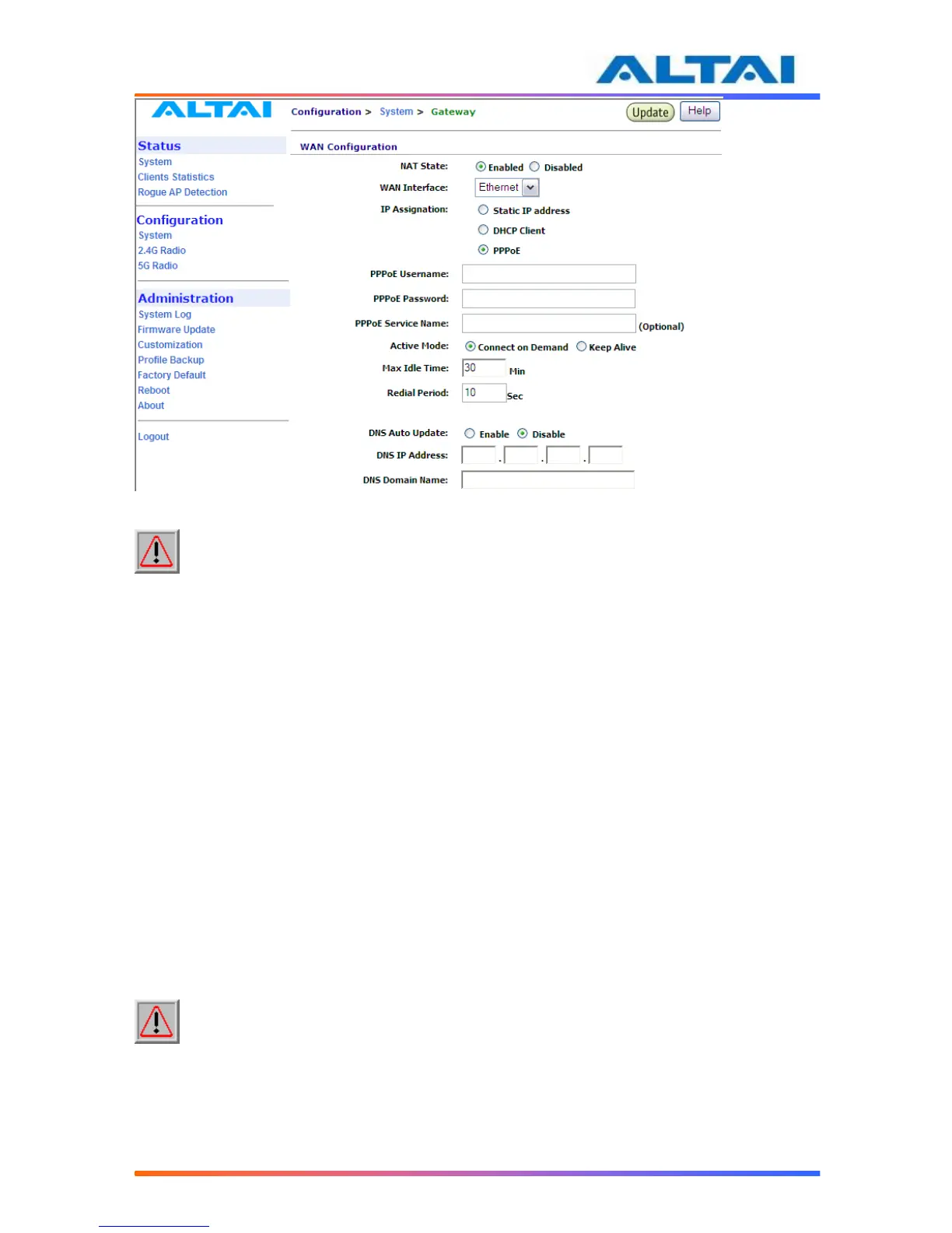 NOTE: The DNS Auto Update should be set to Disable when using PPPoE. User need