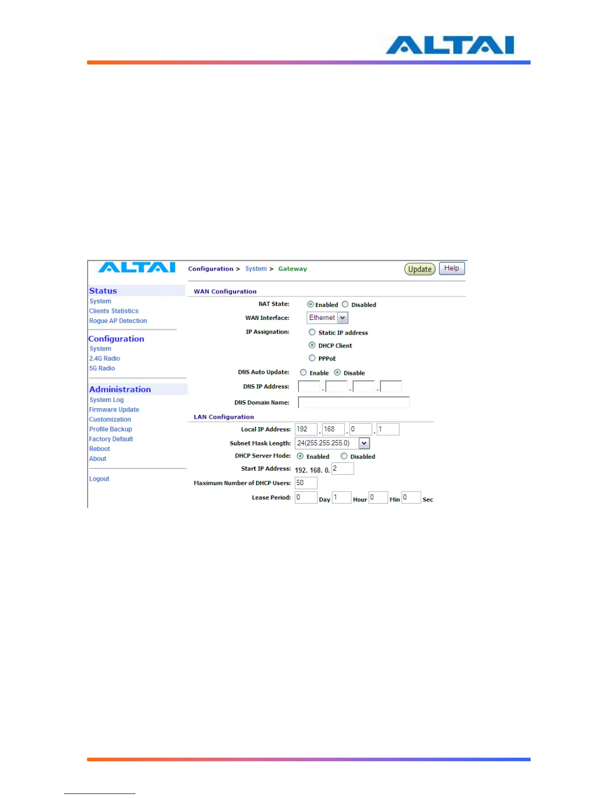 settings specified in the field Start IP Address, Maximum Number of DHCP Users and DNS to