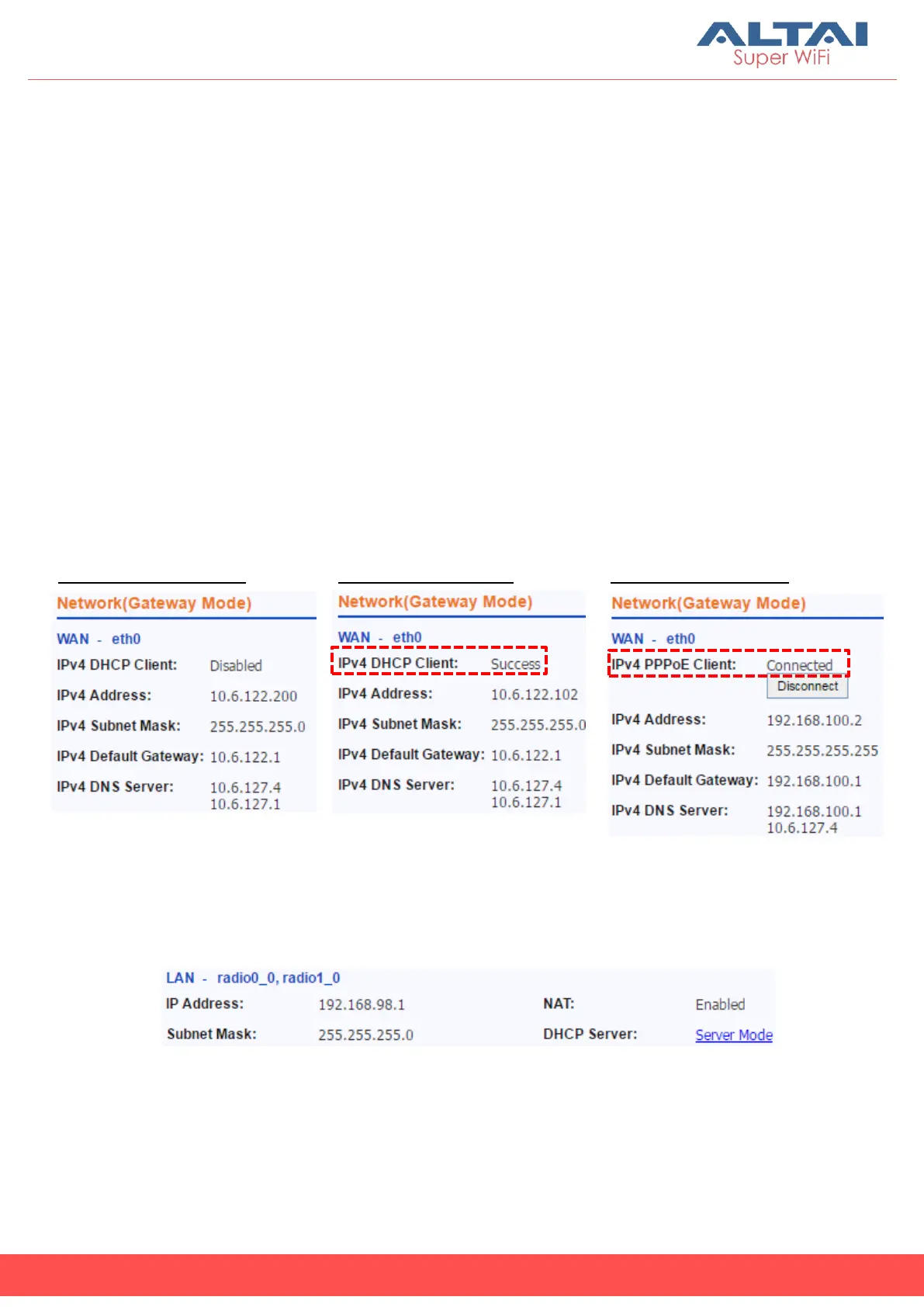 status with valid IP address, Subnet Mask, Default Gateway and DNS