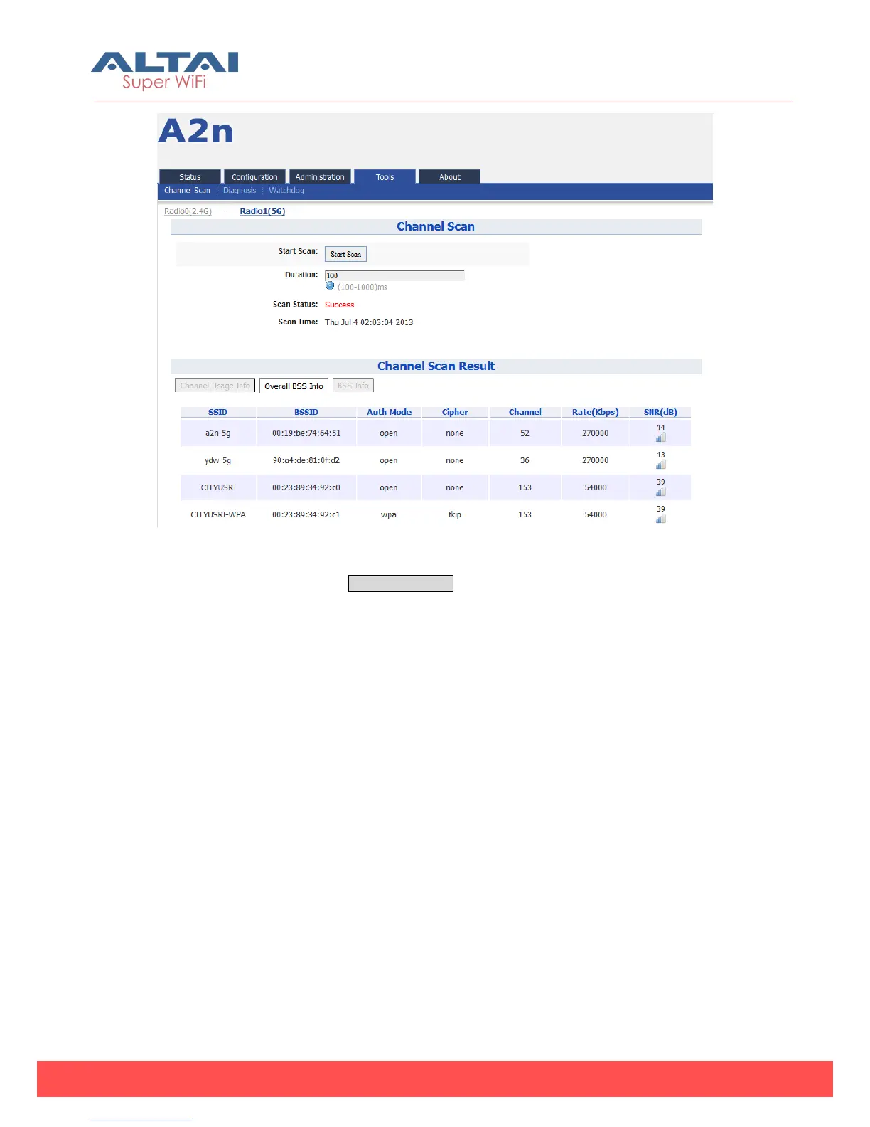 In Channel Scan Result, press Overall BSS Info for 5G BSS Info, it shows information of