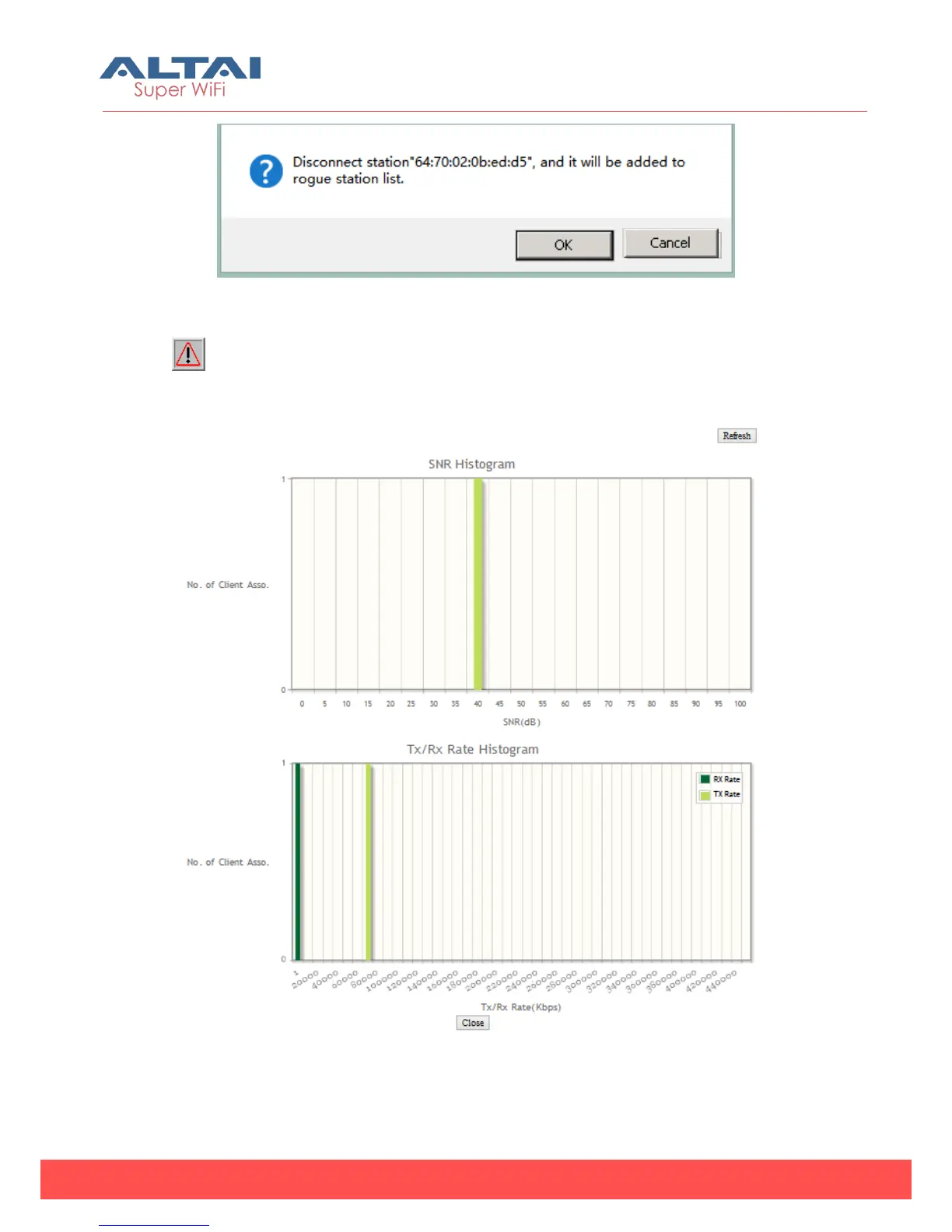 Click the “View Histograms” to view the SNR and Tx/Rx Rate real time Histograms.