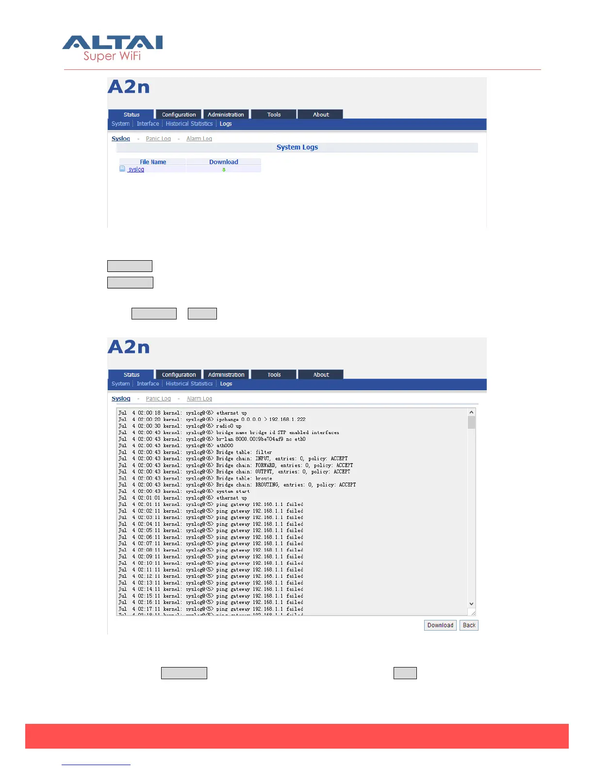Please click Download to download the system log file and click Back at the end of
