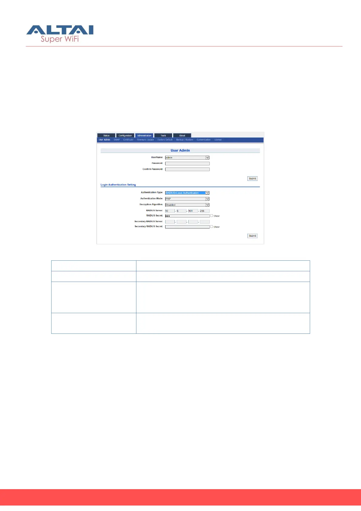 Table 4 describes the authentication setting of A8m (ac) device.