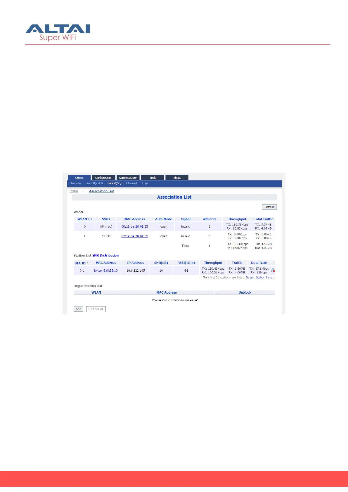 includes Station ID, MAC Address, IP address, SNR(dB) of uplink, RSSI