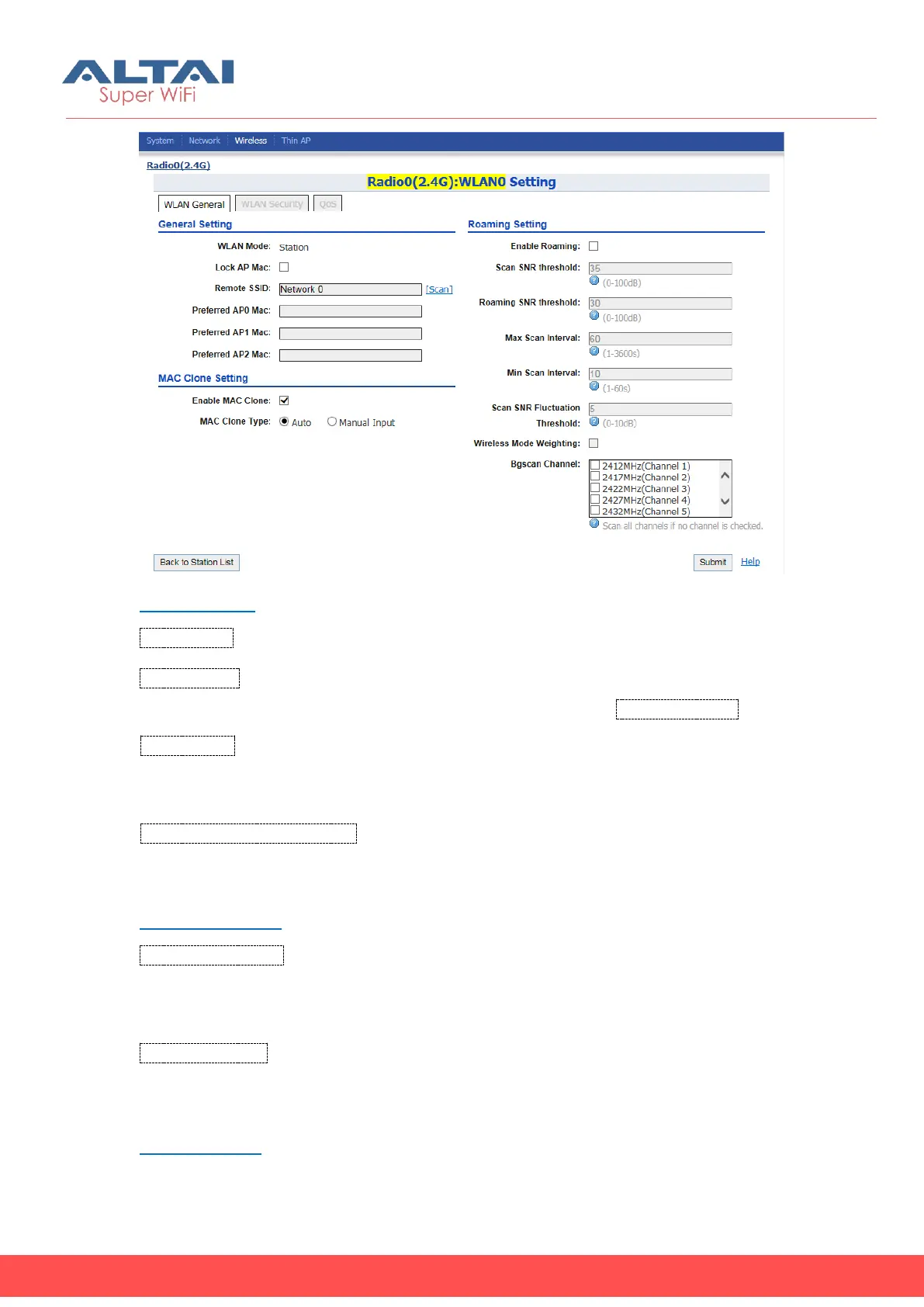 Remote SSID: Specify the SSID of access point that C1n is going to associate; the SSID