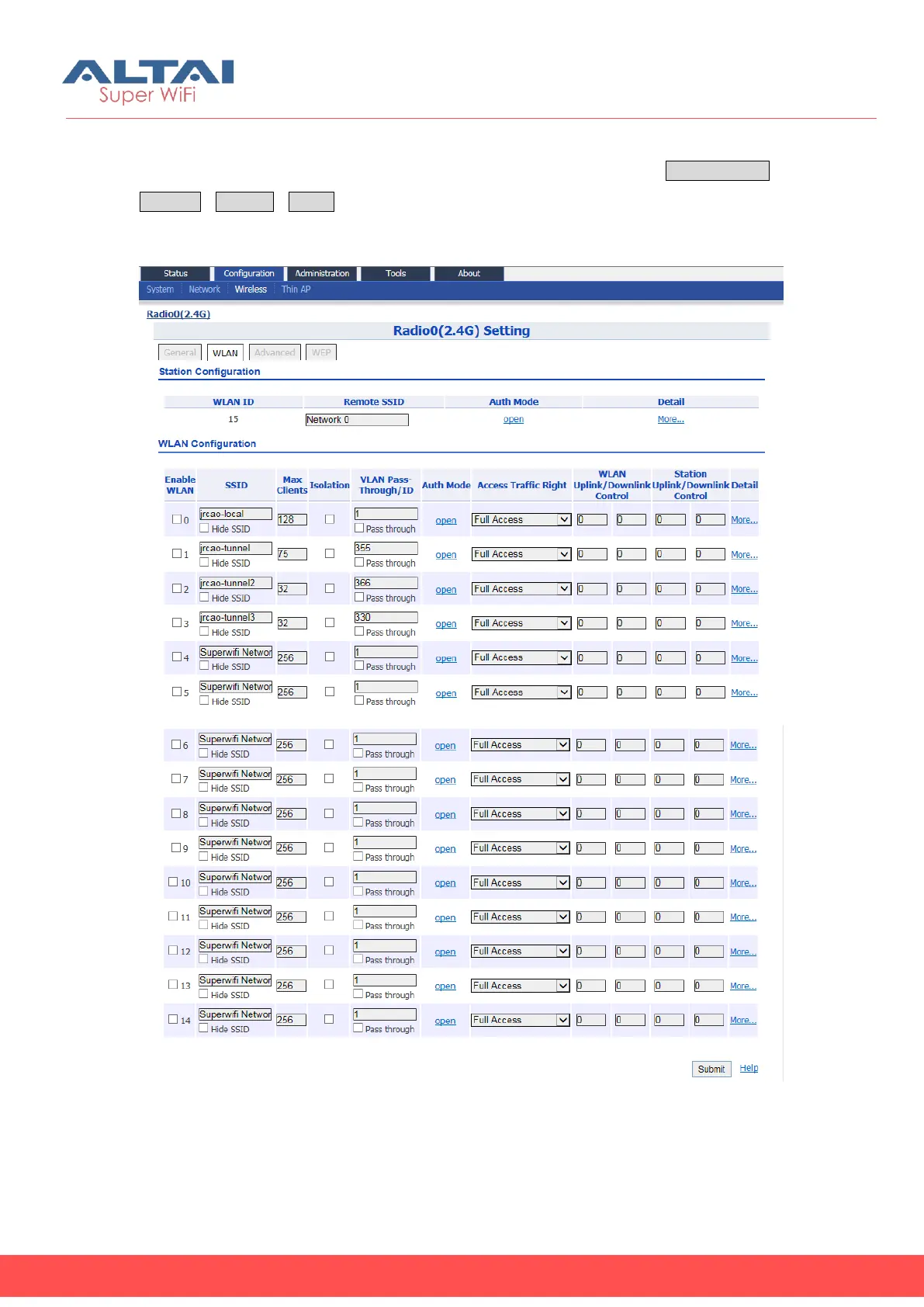 C1n Series AP/CPE radio0 supports maximum 15 WLANs (SSIDs) and associate 1