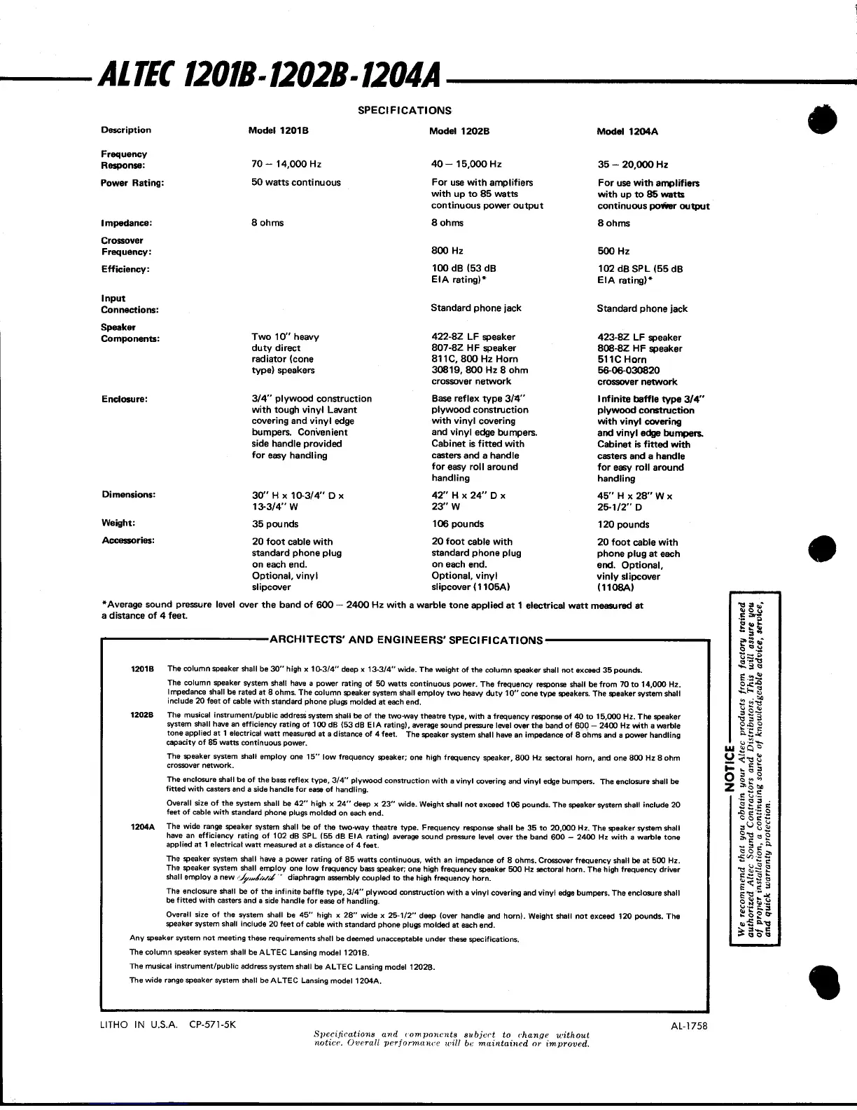 Altec Lansing 1201B - Technical Specifications; Model 1201 B Specifications; Model 1202 B Specifications; Model 1204 A Specifications