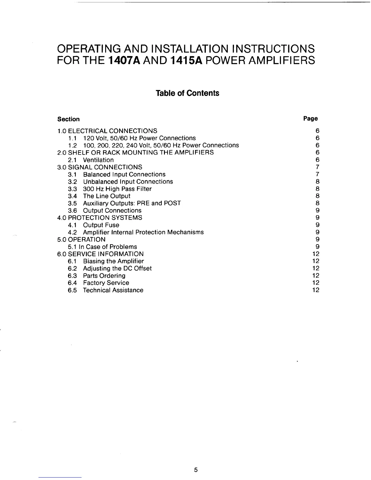 Altec Lansing 1407A POWER AMPLIFIER - Table of Contents