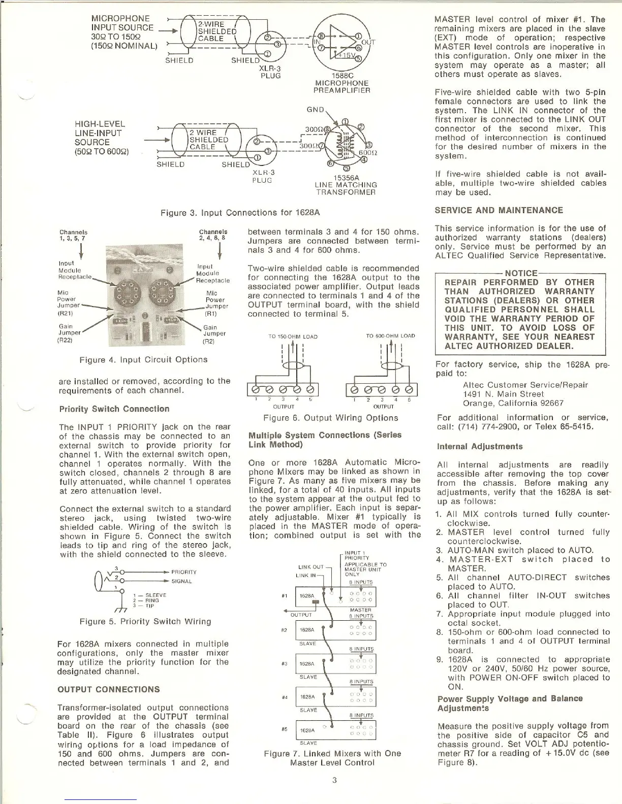 Altec Lansing 1628A SIGNAL PROCESSING - Service and Maintenance; Priority Switch Connections; Output Connections; Internal Adjustments