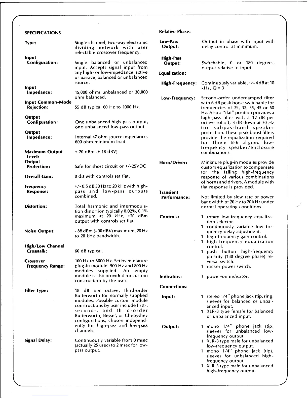 Altec Lansing 1631A SIGNAL PROCESSING - SPECIFICATIONS; Type; Input Configuration; Input Impedance