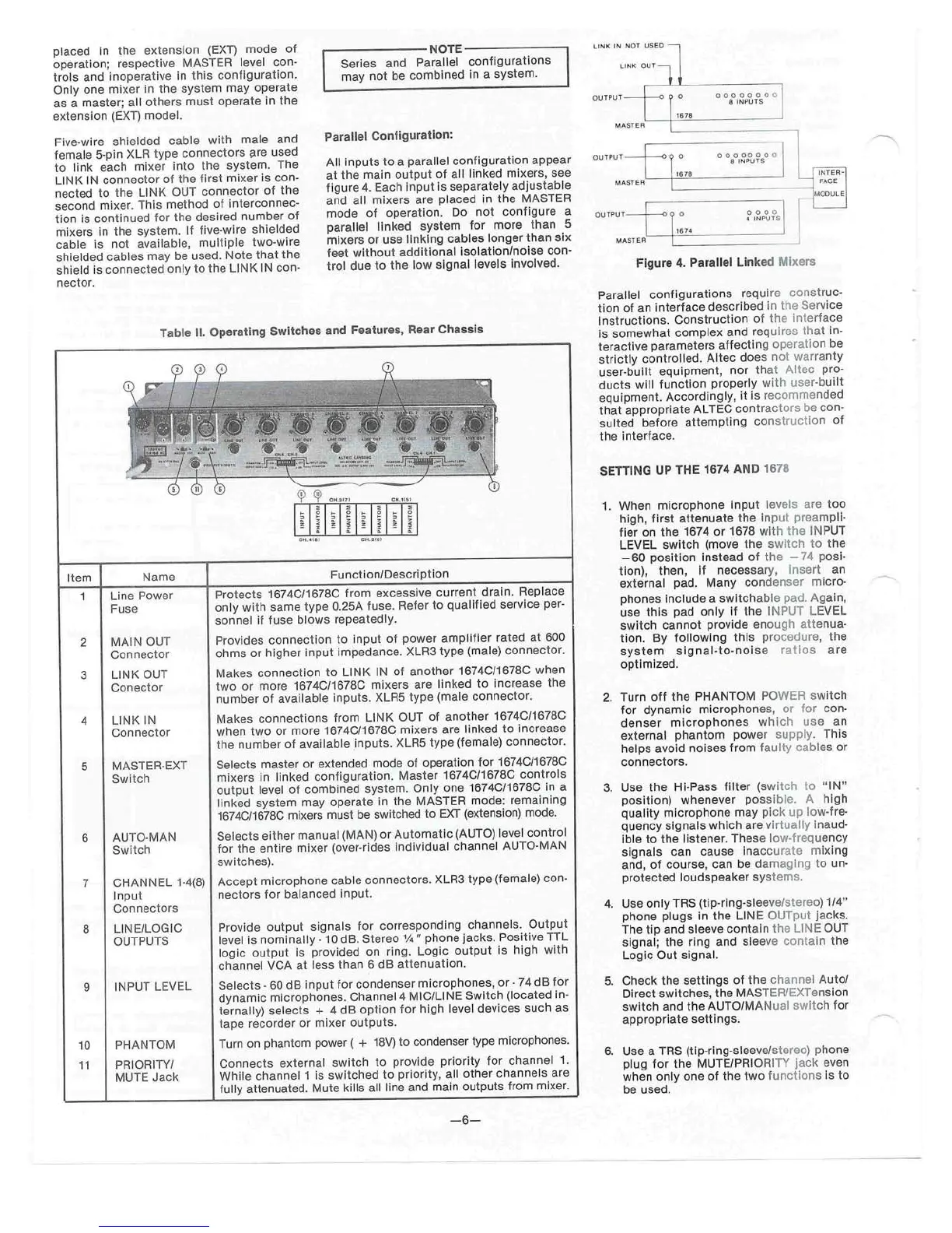 Altec Lansing 1678C SIGNAL PROCESSING - Operating Switches and Features (Rear Chassis); Rear Panel Controls and Connectors; Setting Up the 1674 and 1678; Input Level and Phantom Power Settings