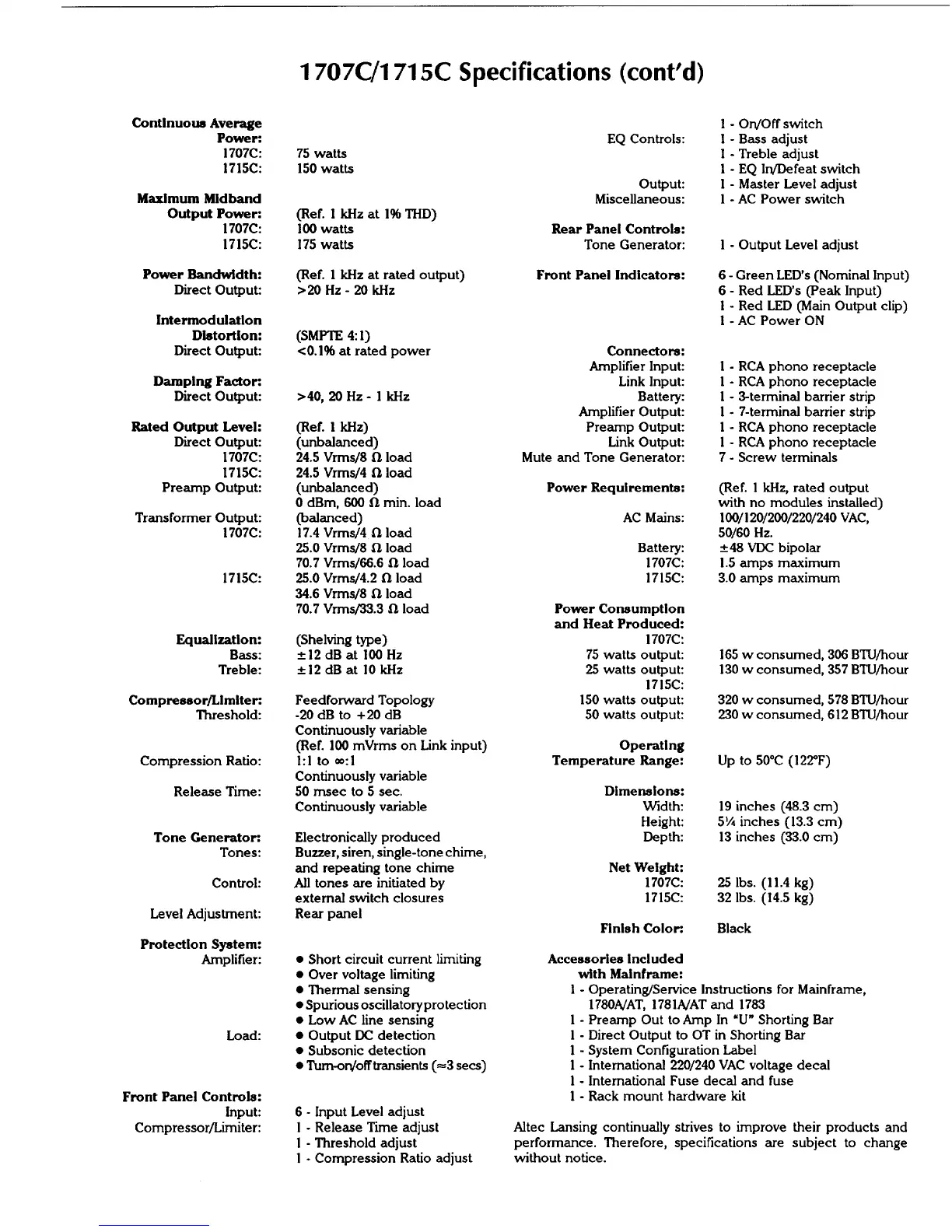 Altec Lansing 1707C - Detailed System Specifications; Power Output and Bandwidth; Distortion and Damping Factor; Output Levels and Transformer Specs