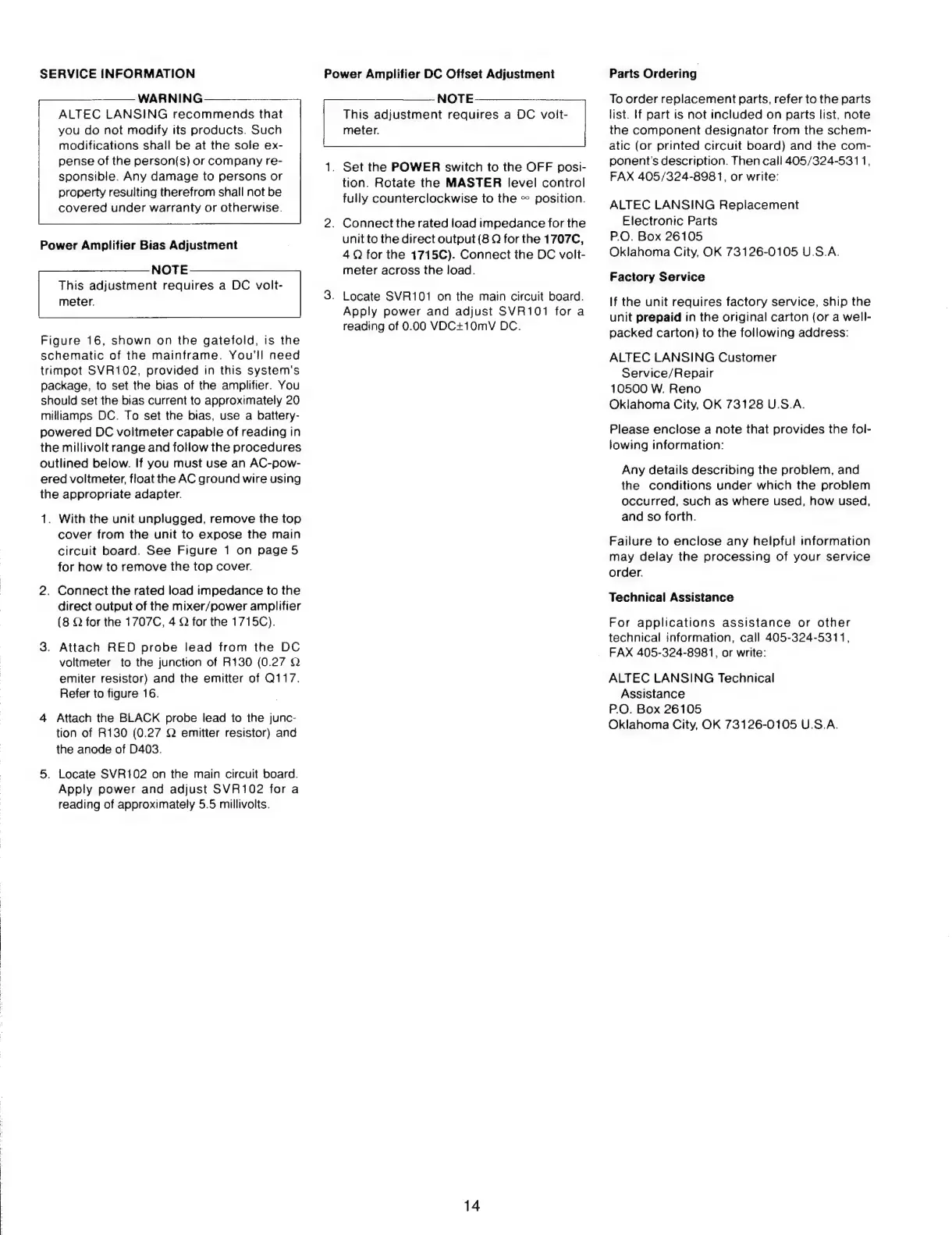 Altec Lansing 1707C - Service, Parts, and Support; Service Information; Power Amplifier Bias Adjustment; Power Amplifier DC Offset Adjustment
