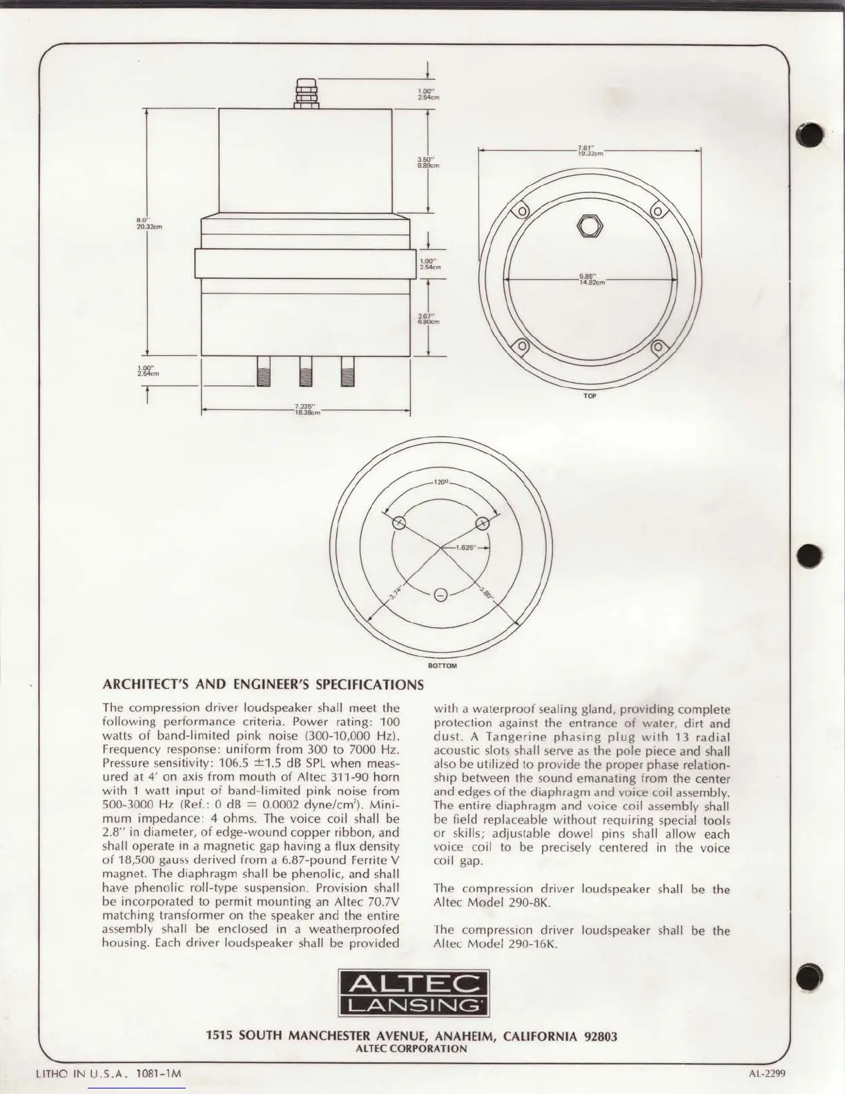 Altec Lansing 290 HF DRIVERS - Altec 290-8 K;290-16 K Specifications; Performance Metrics for 290-8 K;16 K; 290-8 K;16 K Engineering Specs