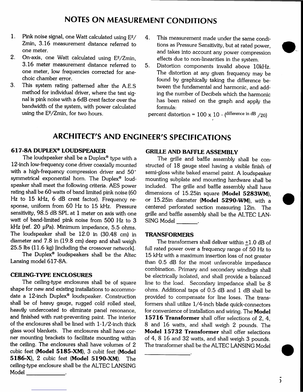 Altec Lansing 617-8A CEILING SPEAKER - Notes on Measurement Conditions; Ceiling-Type Enclosures; Grille and Baffle Assembly; Transformers