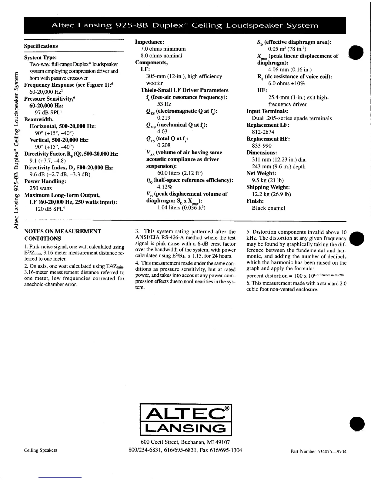 Altec Lansing 925-8B CEILING SPEAKER - Detailed Specifications; System Type and Components; Thiele-Small LF Driver Parameters; Dimensions, Weight, and Finish