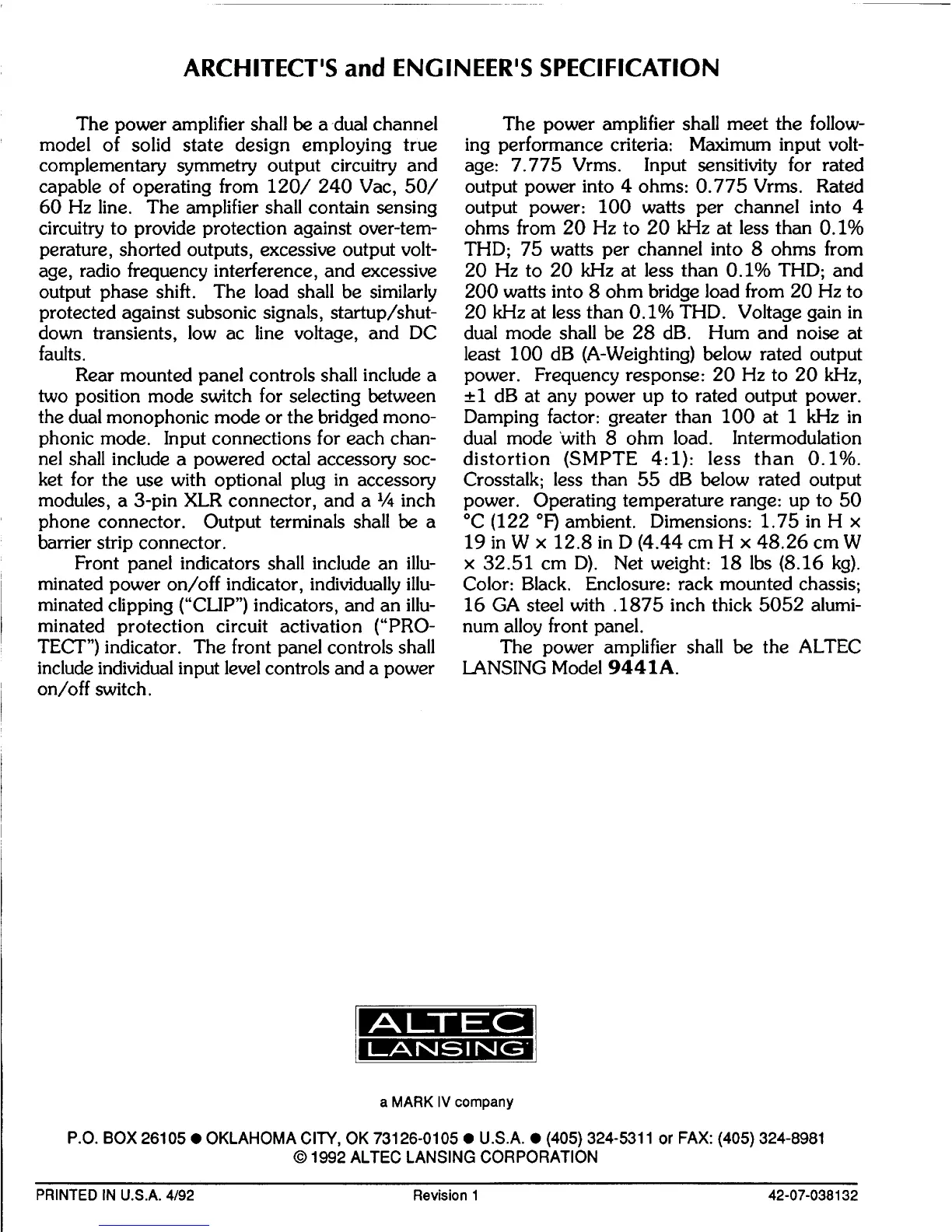 Altec Lansing 9441A - OPERATION; Dual Mode of Operation; Bridge Mode of Operation
