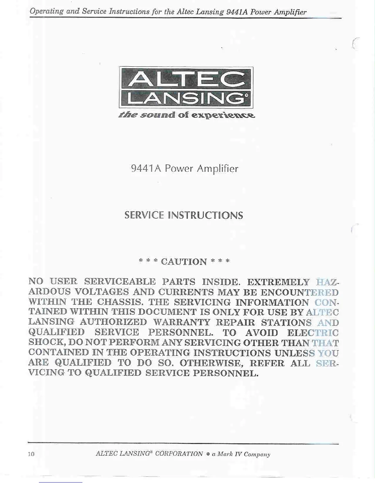 Altec Lansing 9441A - SERVICE INSTRUCTIONS