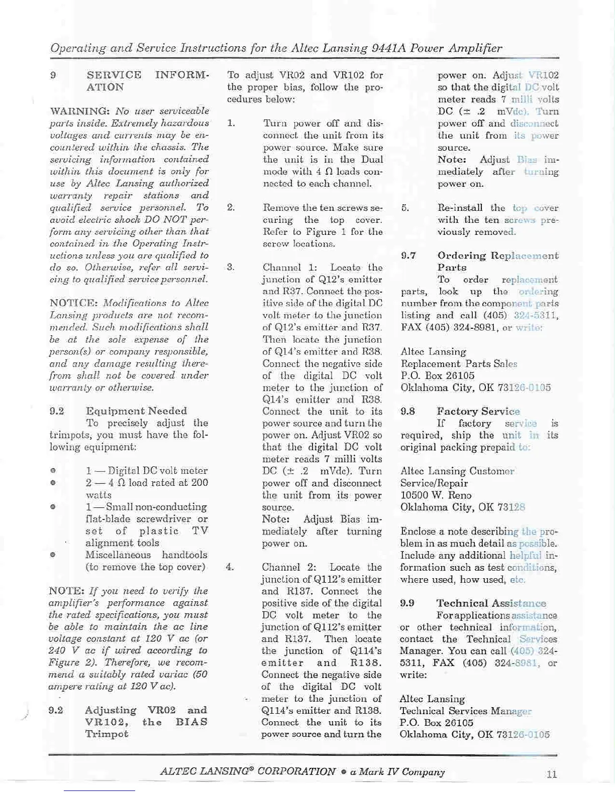 Altec Lansing 9441A - SERVICE INFORMATION; Equipment Needed; Adjusting VR02 and VR102, the BIAS Trimpot; Ordering Replacement Parts