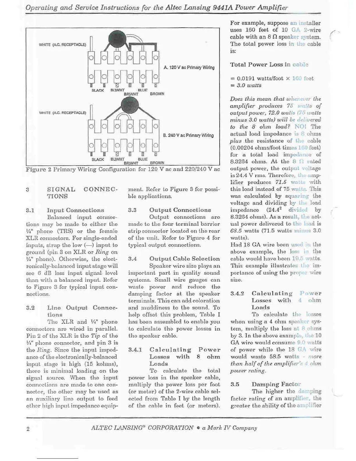 Altec Lansing 9441A - SIGNAL CONNECTIONS; Input Connections; Line Output Connections; Output Connections